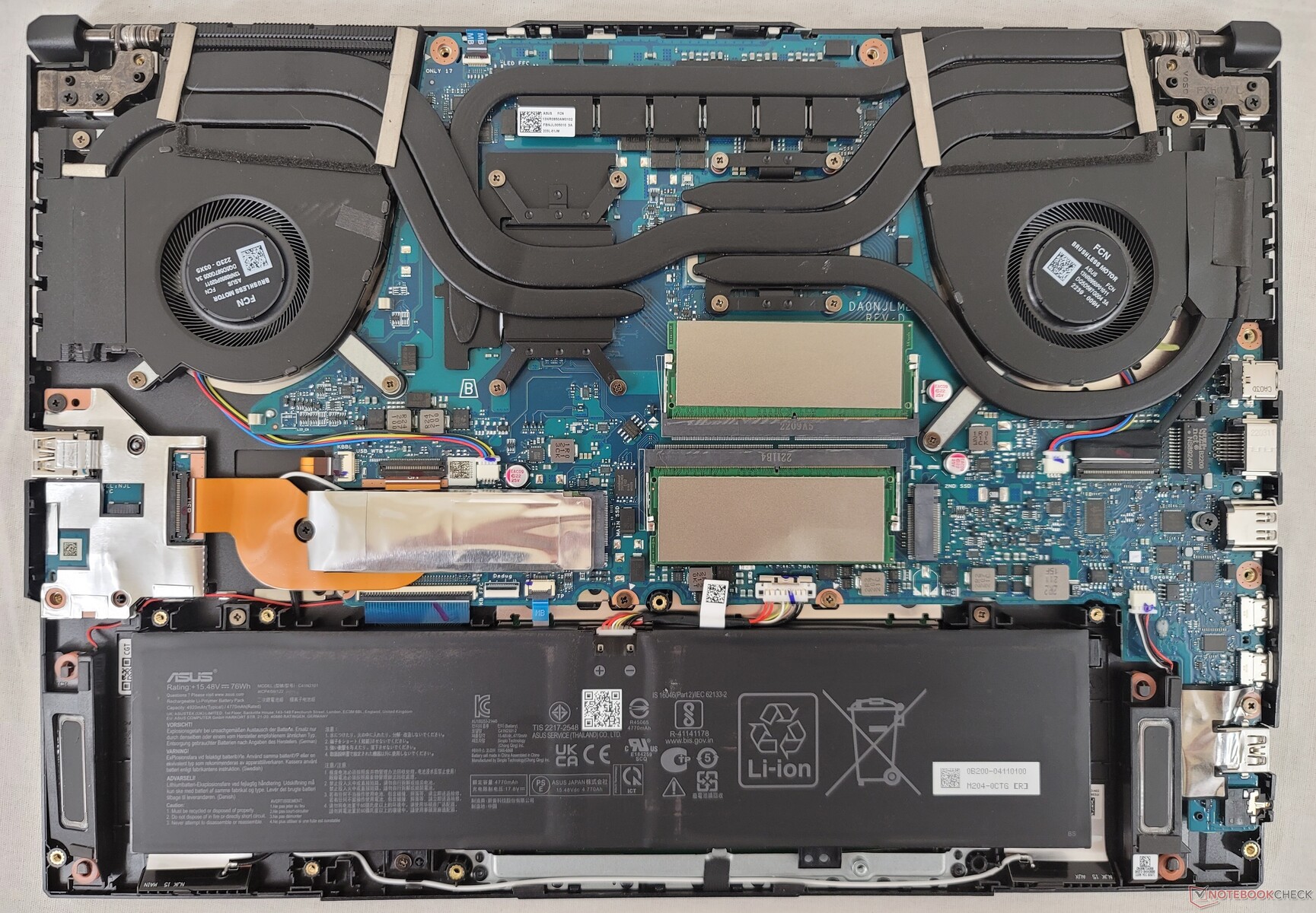 Het bodempaneel kan zeer eenvoudig worden verwijderd met slechts een Philips schroevendraaier om 2x M.2 opslag bays, 2x SODIMM slots, en de WLAN module te onthullen die is weggestopt onder de primaire M.2 SSD. In vergelijking met de FX517ZR, maakt onze FX517ZC gebruik van minder koperen heat pipes boven de GPU, zoals hieronder getoond, voor een iets lichter gewicht.