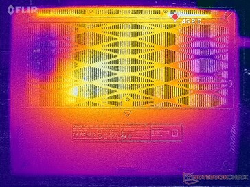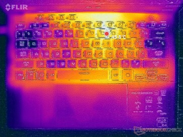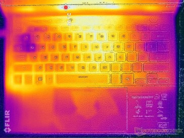 De oppervlaktetemperaturen zijn voorspelbaar erg warm door de hoge prestaties per volume. Hete plekken op het toetsenbord en het onderpaneel kunnen oplopen tot respectievelijk 50 C en 47 C, terwijl de handpalmsteunen een zweterige 35 C kunnen bereiken. Zowel de Lenovo Legion Slim 5 14 en Omen Transcend 14 zijn koeler dan onze Asus, terwijl de Predator Helios Neo 14 nog warmer is. In de praktijk zijn de hoge oppervlaktetemperaturen merkbaar, maar niet storend tijdens het gamen, omdat de warmste plekken zich in het midden bevinden en op afstand van de WASD-toetsen.