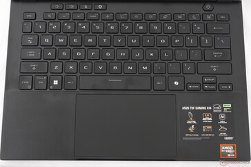 Het glazen clickpad is iets kleiner dan dat van de ROG Zephyrus G14 (12,7 x 7,8 cm vs. 12,7 x 8 cm), maar nog steeds ruim voor een 14-inch vormfactor. De grip is soepel, met slechts een beetje kleven bij lagere snelheden voor nauwkeuriger klikken en slepen. De feedback bij het klikken is scherper en steviger dan verwacht, zodat het prettiger in het gebruik is dan het zachtere maar nog grotere clickpad op de Blade 14.