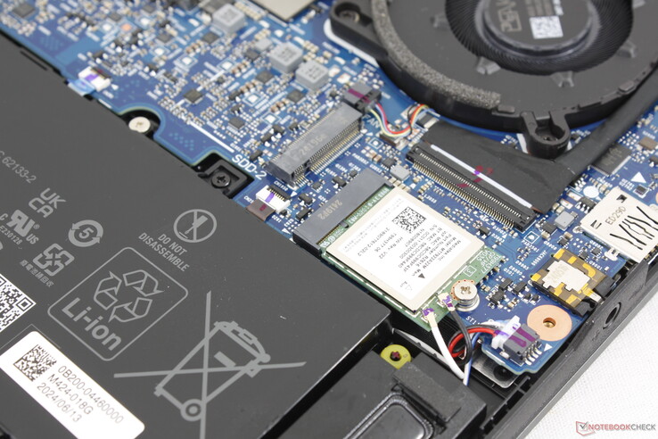 Het onderpaneel wordt vastgezet met 11 kruiskopschroeven voor eenvoudig onderhoud. De indeling van het moederbord heeft veel gemeen met de recente 2024 Zephyrus G14 zoals blijkt uit de vergelijkende foto's hieronder, maar het TUF-model laat de derde ventilator achterwege ten gunste van een tweede M.2 2280 PCIe4 x4 SSD-uitbreidingssleuf om een van de weinige 14-inch gaming laptops te zijn die twee M.2 SSD's van volledige lengte ondersteunt. Op basis van onze temperatuurwaarnemingen had het systeem echter waarschijnlijk baat gehad bij extra koeling.