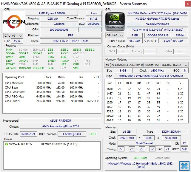 | 85 % v7 (old) | 07-2021 | Asus TUF Gaming A15 FA506QR-AZ061T R7 5800H, GeForce RTX 3070 Laptop GPU | 2.3 kg | 24 mm | 15.60" | 1920x1080 | |