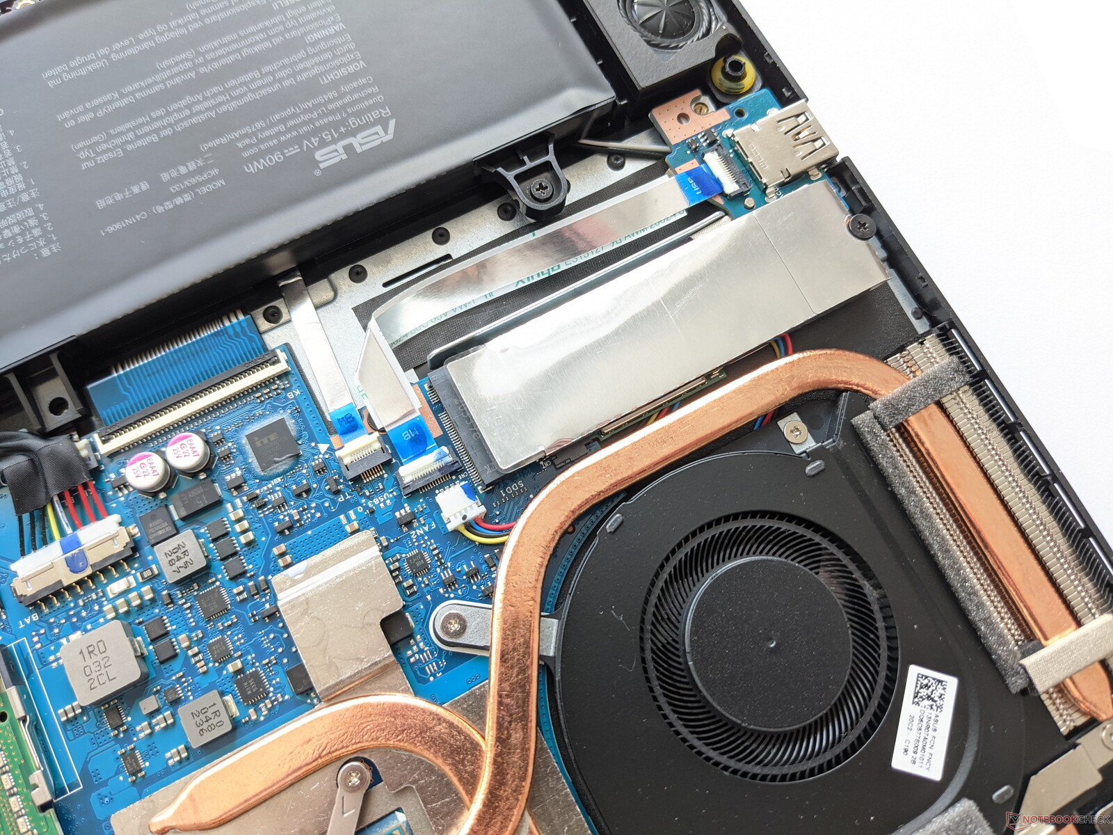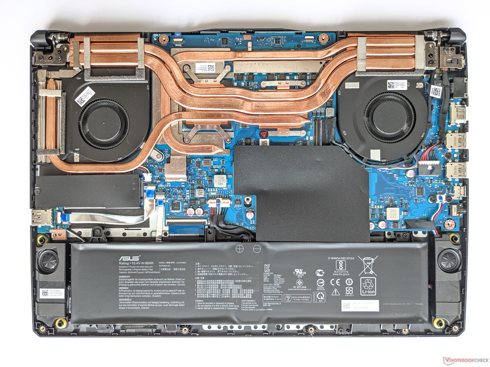 Het bodemdeksel van de Asus TUF Gaming A15 kan worden verwijderd na het losdraaien van alle schroeven aan de onderzijde. Twee RAM en twee SSD slots zijn binnenin te vinden, zodat je geheugen of massaopslag kunt uitbreiden of vervangen. De WLAN module onder de primaire SSD kan ook op deze manier worden bereikt