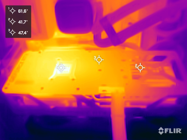 De grote koelplaat is voldoende om de volledige 360W TGP van de GPU aan te kunnen. Tijdens de stresstests registreerden we een piektemperatuur van 64,3°C voor de GPU-kern, terwijl de VRAM-temperaturen met 62°C iets lager bleven. Helaas konden we de GPU hotspot temperatuur niet meten, en het blijft onduidelijk of Nvidia dit in toekomstige updates mogelijk zal maken. Toegang tot deze gegevens zou waardevol zijn, omdat het zou kunnen helpen bij het opsporen van mogelijke problemen met de warmteoverdracht die worden veroorzaakt door materiaalveroudering na verloop van tijd.