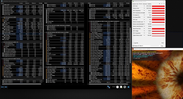 De Asus TUF Gaming Radeon RX 7800 XT OC is uitgerust met een groot koelhuis dat temperatuurproblemen op elk moment voorkomt. We konden dit in onze test bevestigen, en met een GPU hotspot temperatuur van slechts 76 °C (169 °F) blijft de grafische kaart verrassend koel. Bij 94 °C (201 °F) voor het VRAM meten we echter een hogere waarde, hoewel dit nog steeds geen effect heeft op de prestatiemogelijkheden.