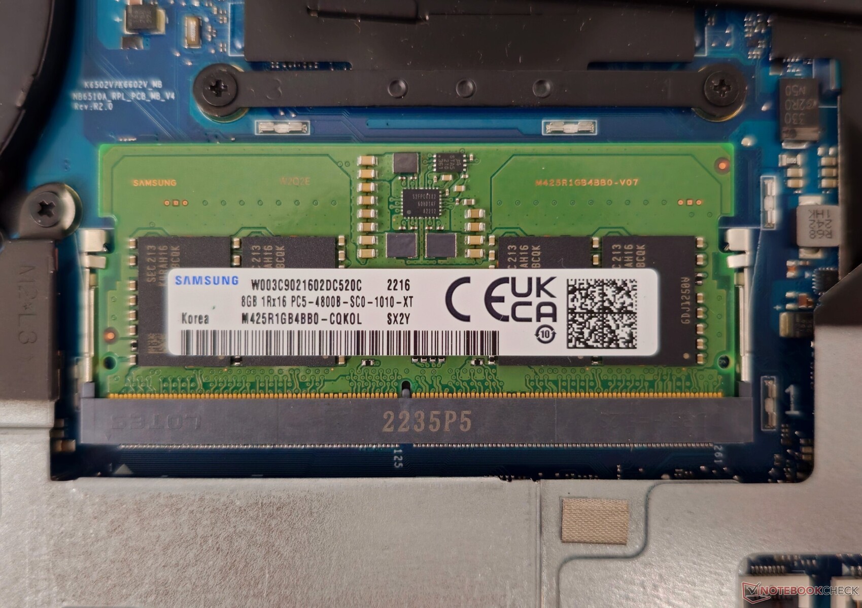 Uitbreiding van het RAM-geheugen is beperkt tot maximaal 24 GB, aangezien 8 GB DDR5-geheugen op het moederbord is gesoldeerd en er slechts één SO-DIMM-sleuf beschikbaar is voor het toevoegen van meer RAM-geheugen.