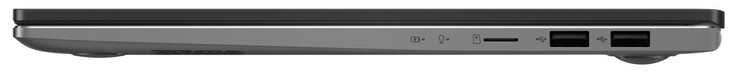 De laptop heeft drie USB-A poorten (2x USB 2.0, 1x USB 3.2 Gen 1) en een USB-C poort (USB 3.2 Gen 1). Deze laatste biedt geen ondersteuning voor Power Delivery of Displayport via USB-C. Er is dus slechts één video-uitgang beschikbaar met de HDMI-poort. De microSD geheugenkaartlezer (referentiekaart: AV PRO microSD 128 GB V60) is een van de traagste in zijn soort.