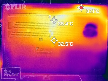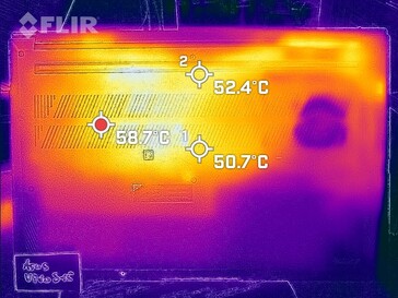 In tegenstelling tot het geluidsniveau dat hij produceert, wordt de laptop slechts matig warm onder extreme omstandigheden. Tijdens onze tests bereikten de temperaturen van het chassis op sommige plaatsen slechts 50°C (122°F). Dit viel ons niet op, laat staan dat het ons stoorde, vooral omdat de palmsteun koel bleef.