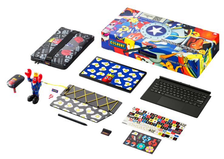 De 2-in-1 en zijn accessoires zijn dus voorzien van de kenmerkende Paul Colbert kreeftenfiguren (ook te vinden in de doos als een combinatie van actiefiguur/stylus-houder) of een grotere verscheidenheid aan smiley's en heldere ontwerpen in het geval van de Vivobook 13 Slate OLED Steven Harrington editie.
