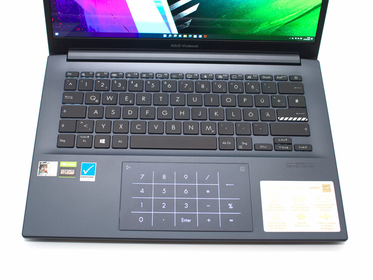 Net als veel recente Asus-laptops heeft de VivoBook Pro 14 OLED een verborgen numpad in het touchpad. Eenmaal geactiveerd, licht het op achter het zwarte ClickPad. Muisbesturing is nog steeds mogelijk, maar enigszins beperkt, aangezien een tik geen muisklik activeert, maar een symbool invoert waar van toepassing. In de praktijk blijkt het virtuele numerieke toetsenbord handig te zijn bij het invoeren van gegevens.