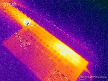De oppervlaktetemperaturen zullen altijd warmer zijn aan de rechterhelft van de laptop dan aan de linkerhelft door de plaatsing van de processor binnenin. De hot spot op het toetsenbord kan oplopen tot 40 C, zoals te zien is op de onderstaande temperatuurkaart, die vergelijkbaar is met de snellere Yoga Pro 7 14ARP G8 onder vergelijkbare belasting. Het Lenovo model kan echter veel warmer zijn aan de onderkant met bijna 7 C.