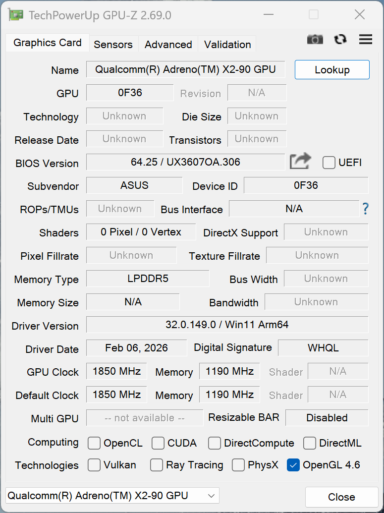 | Asus Zenbook A16 UX3607 Qualcomm Snapdragon X2 Elite Extreme X2E-94-100 ⎘ Qualcomm Adreno X2-90 ⎘ 48 GB Geheugen, 1000 GB SSD | 1.2 kg | 16.5 mm | 16.00" 2880x1800 212 PPI OLED | ||