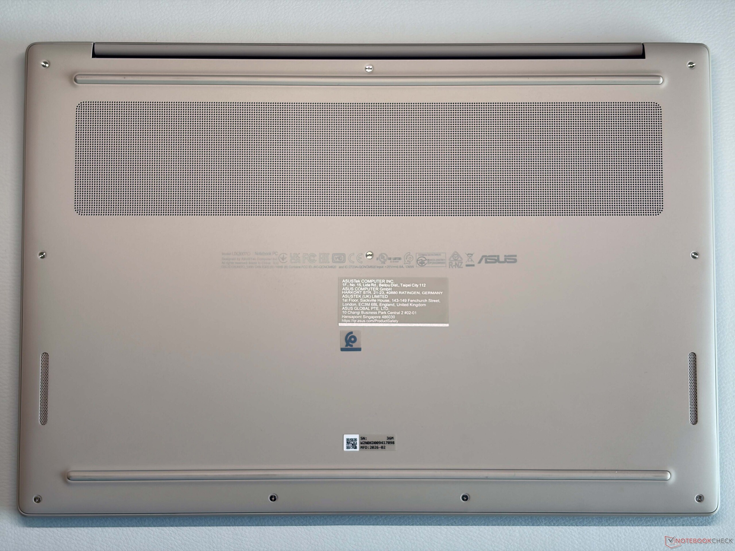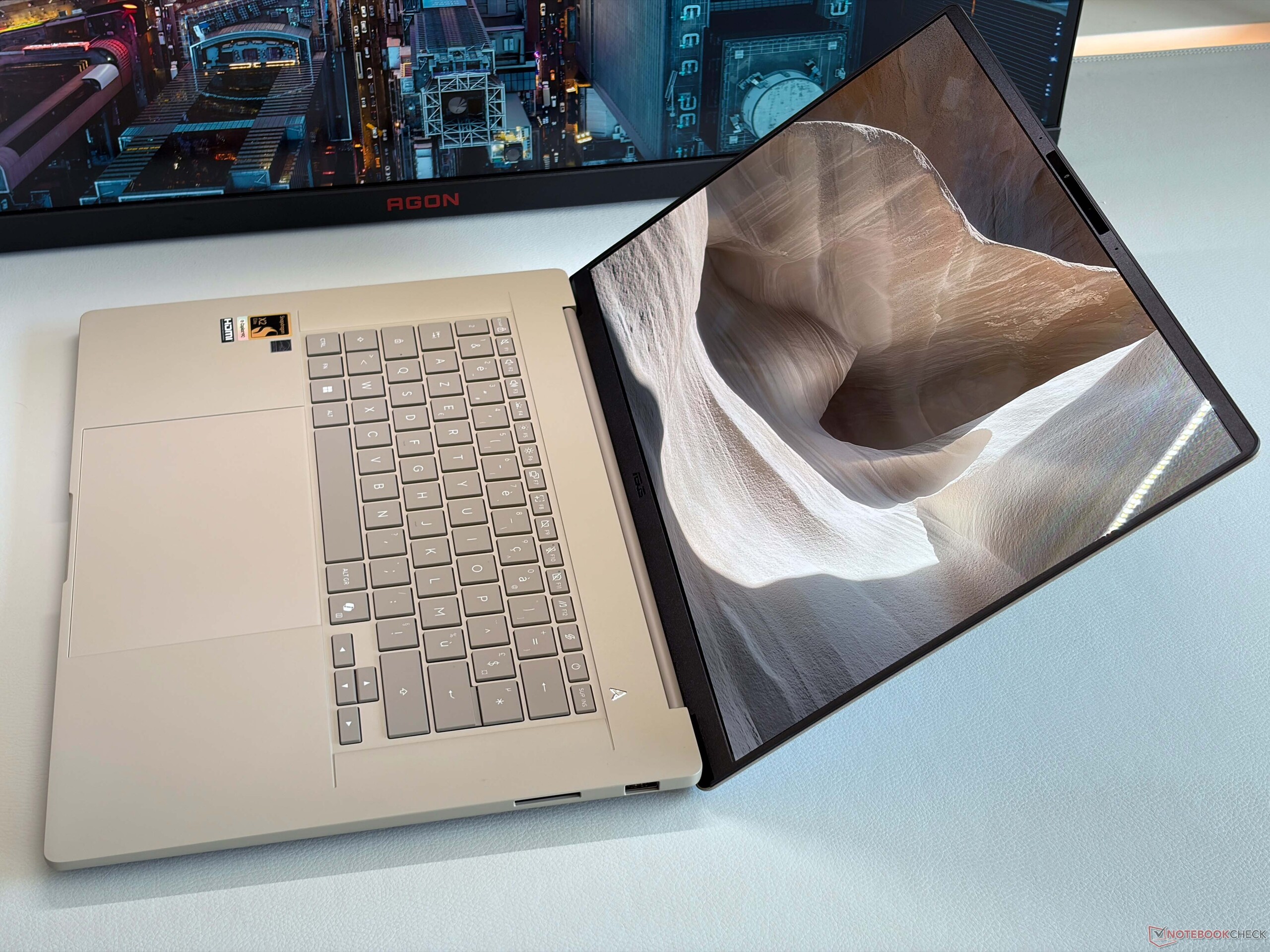 Het ontwerp van de behuizing volgt de kleinere Zenbook A14 en de 16-inch Zenbook A16 is ook verkrijgbaar in de bekende kleuren Iceland Gray of Zabriskie Beige. Vergeleken met de Zenbook S16 met AMD-motor is de basiseenheid ronder en het totale gewichtsverschil is met meer dan 300 gram zeer merkbaar. Asus gebruikt zijn ceraluminium materiaal voor de chassisconstructie en hoewel de A16 een zeer licht apparaat is, is het toch zeer stabiel en stevig en voelt het zelfs een beetje dichter aan in vergelijking met de kleinere Zenbook A14 (minder dan 1 kg). Er zijn geen krakende geluiden en de stabiliteit van de basiseenheid is uitstekend. Het deksel is iets flexibeler, maar dit is geen probleem. We hadden graag een betere kalibratie van de scharnieren gezien (max. openingshoek ~135 graden), want het deksel wiebelt een beetje.