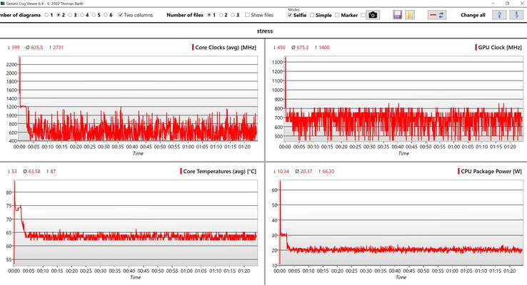 De metalen behuizing blijft aangenaam koel in de ruststand en tijdens eenvoudige taken, maar ook onder belasting waren er geen problemen. De hotspot bevindt zich centraal in het achterste gedeelte aan de onderkant van de basiseenheid, waardoor de convertible ook op de dijen geplaatst kan worden. Het voordeel hiervan is dat het toetsenbord een apart onderdeel is en daarom niet bijzonder warm wordt, zodat gebruikers ook onder hoge belasting comfortabel kunnen typen. In de stresstest draaide de processor aanvankelijk op 64 watt, daalde daarna een paar minuten naar 30 watt en kwam uiteindelijk uit op 20 watt.