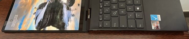 Het bereik van de poorten wordt hier beperkt door het koelsysteem: Drie langwerpige koeluitgangen zijn centraal aan elke kant van het toestel geplaatst. Er zijn in totaal zes poorten. In plaats van Thunderbolt 4 heeft de Asus Zenbook Flip 14 twee USB 3.2 Gen2 poorten met Power Delivery en Displayport ondersteuning. De poorten zijn met voldoende afstand tot elkaar geplaatst, zodat er geen beperkingen zijn in het gebruik. Het apparaat beschikt niet over een Kensington-slot. Voor een LAN-aansluiting en extra USB-poorten is hier een dock nodig.
