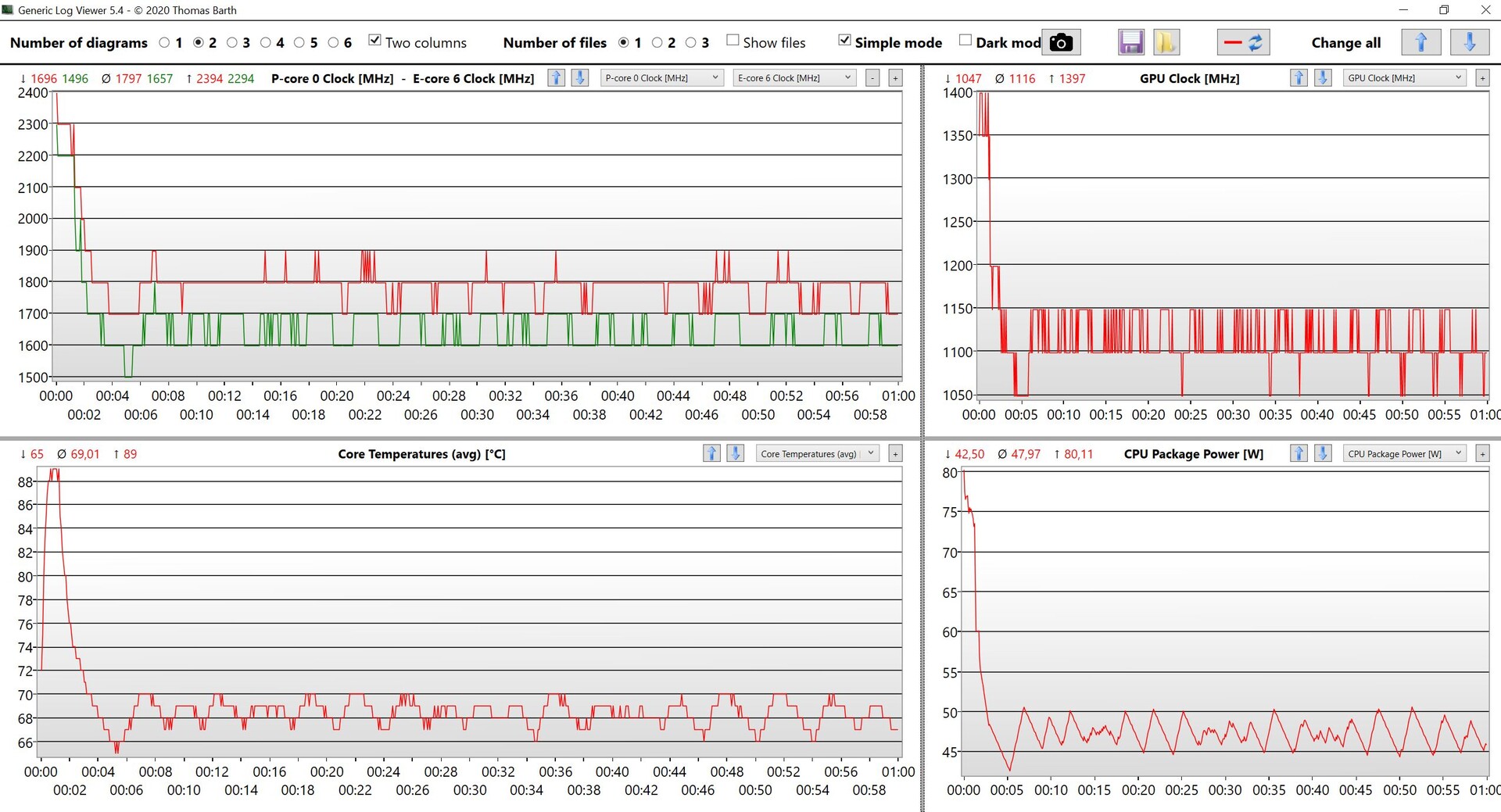 In de stresstest met gecombineerde CPU/GPU belasting, komt de processor al snel op een verbruik van 45-50 Watt. In dit geval werkt de grafische kaart nog steeds op een kloksnelheid van ~1,1 GHz en de processor op ongeveer 1,7-1,8 GHz. Er was geen prestatievermindering direct na de stresstest.