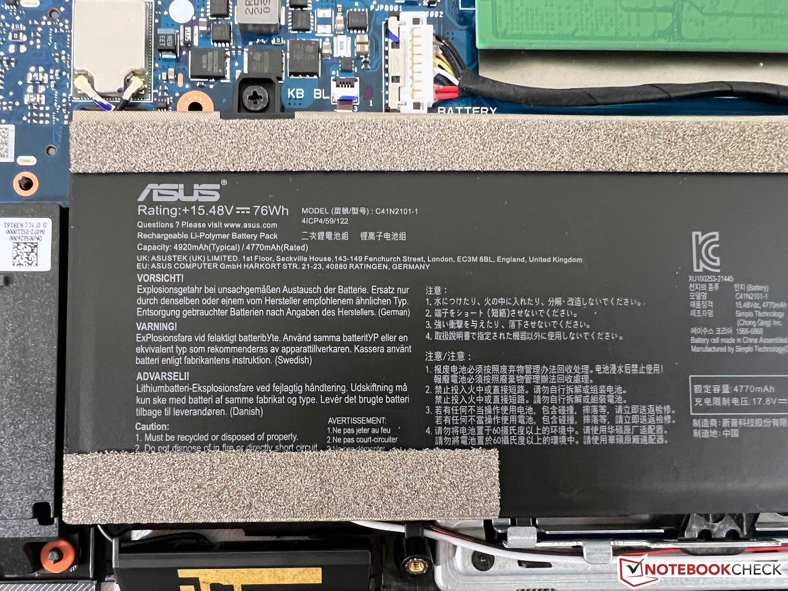 Asus gebruikt een metalen chassis en zowel de basiseenheid als het schermdeksel zijn extreem stabiel en torsiestijf. De basiseenheid ziet er ook vrij slank uit, wat mogelijk wordt gemaakt door de taps toelopende zijkanten. Dit staat in schril contrast met deApple MacBook Pro 14waarbij de basiseenheid erg volumineus lijkt, hoewel hij eigenlijk dunner is dan de Zenbook. Dit is zeker geen extreem dunne notebook, maar dit is geen punt van kritiek gezien de krachtige componenten.
