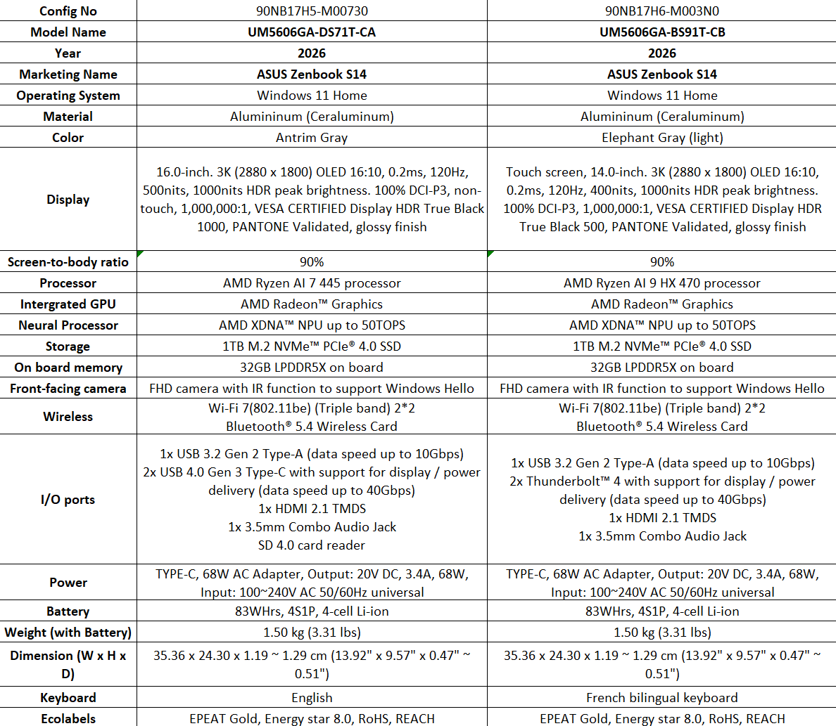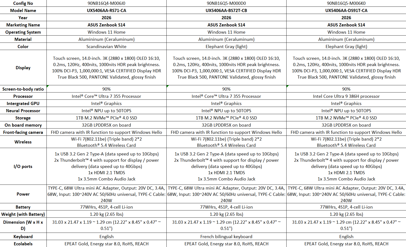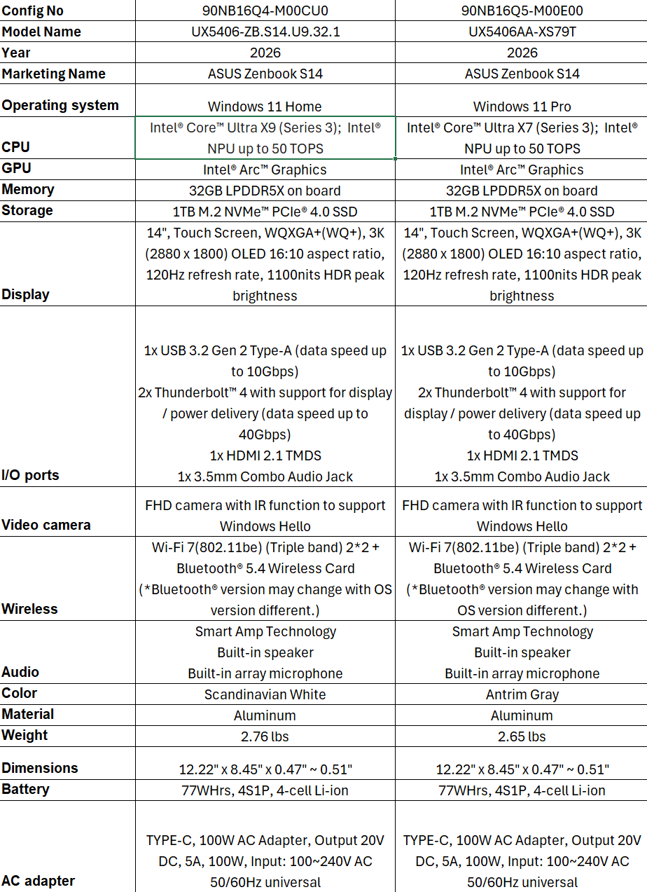 Volgens het persmateriaal van Asus biedt de Amerikaanse versie van de Zenbook S14 Core Ultra X7 en Core Ultra X9 opties, terwijl de Canadese SKU's beperkt zijn tot de Core Ultra 9 386H en de Core Ultra 7 355. Units die in Europa verkocht worden, zullen naar verwachting ook de Core Ultra X Series 3 CPU's krijgen, met geïntegreerde Arc B390 graphics.