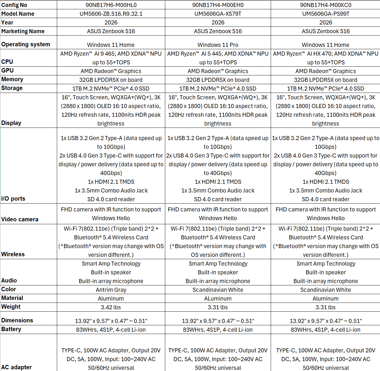 De Zenbook S16 (UM5606), aan de andere kant, is uitgerust met de nieuwe AMD Ryzen AI 400 Gorgon Point APU's. Configuraties voor de Amerikaanse markt zijn onder andere gebaseerd op de Ryzen AI 9 HX 470, Ryzen AI 9 465en een vreemde Ryzen AI 5 445 (waarschijnlijk een typefout) die nog niet in AMD's lijst staat.