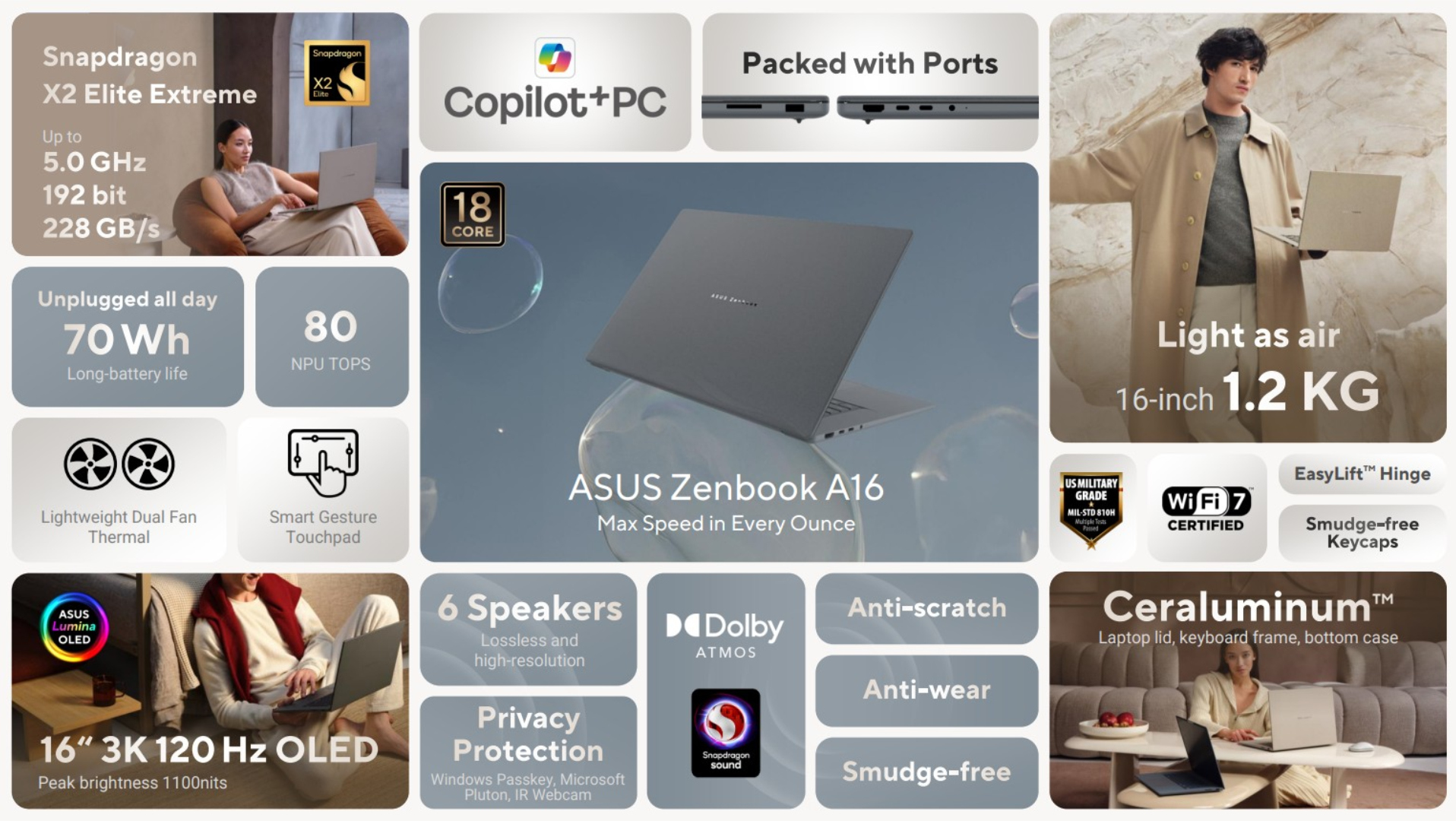 Terwijl de nadruk blijft liggen op de Amerikaanse release van de laptop, is Asus stilletjes begonnen met de internationale verkoop van de Zenbook A16. De laptop is bijvoorbeeld al te koop in Australië, de eurozone en het VK. Momenteel zijn alle varianten voorzien van een Snapdragon X2 Elite X2E-94-100 chipset, 48 GB RAM en een SSD van 1 TB.