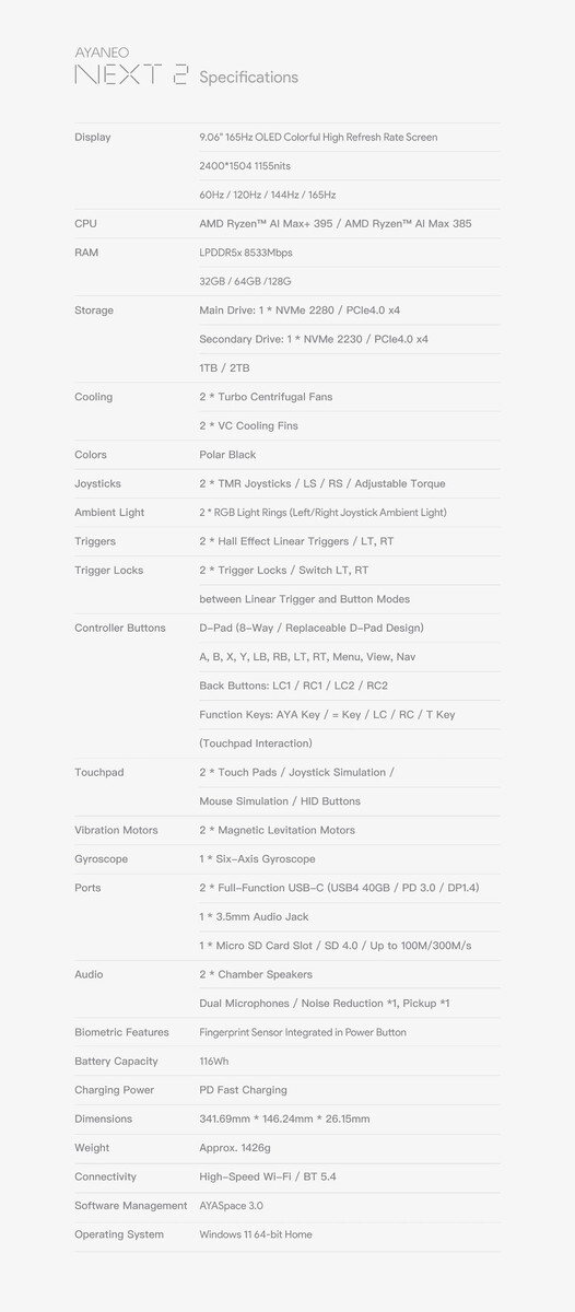 Ayaneo biedt de Next 2 aan met ofwel de Ryzen AI Max 385 of Ryzen AI Max+ 395net als de OneXPlayer Apex en GPD Win 5 ervoor (momenteel $2.399,99 op Amazon). De Next 2 wijkt af van zijn concurrenten met een 9,06 inch OLED-scherm en een 116 Wh externe batterij. Alles bij elkaar weegt de Next 2 341,69 x 146,24 x 26,15 mm en weegt hij ongeveer 1,43 kg. Zie het specificatieblad hieronder voor alle technische details.