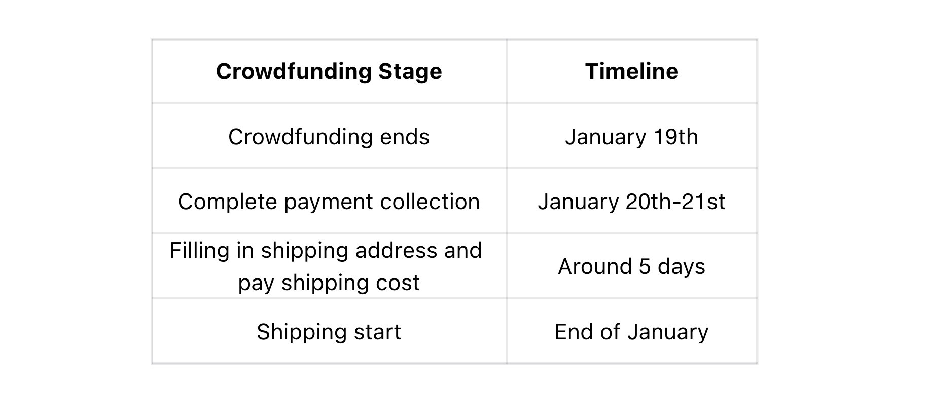 Blijkbaar is het volgens de regels van Indiegogo de bedoeling dat de betalingen binnen 15 dagen na het einde van de campagne worden geïnd. Daarna duurt het nog eens 5 tot 15 dagen voor backers hun verzendgegevens doorgeven en de verzendkosten betalen. Op basis van het bovenstaande zou de verzending eind februari moeten beginnen.