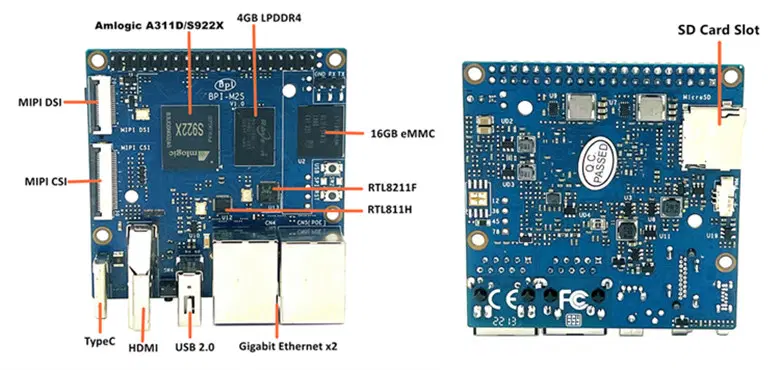 Zoals CNX Softwaremerkt op dat de BPI-M2S beschikbaar is met Amlogic A311D of Amlogic S922X SoCs. Fundamenteel zijn de twee identiek, met vier ARM Cortex-A73 kernen die draaien op 2,21 GHz en nog eens twee Cortex-A53 geklokt op 1,8 GHz. De Amlogic A311D en Amlogic S922X bevatten ook een Mali-G52 MP4 GPU met OpenGL ES 3.2 ondersteuning, maar alleen de eerste heeft een NPU, die tot 5,0 TOPS aan prestaties biedt. Bovendien heeft de Amlogic A311D-versie van de BPI-M2S MIPI CSI- en MIPI DSI-aansluitingen voor respectievelijk camera's en beeldschermen.
