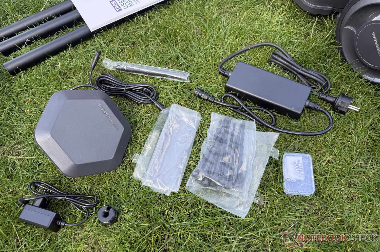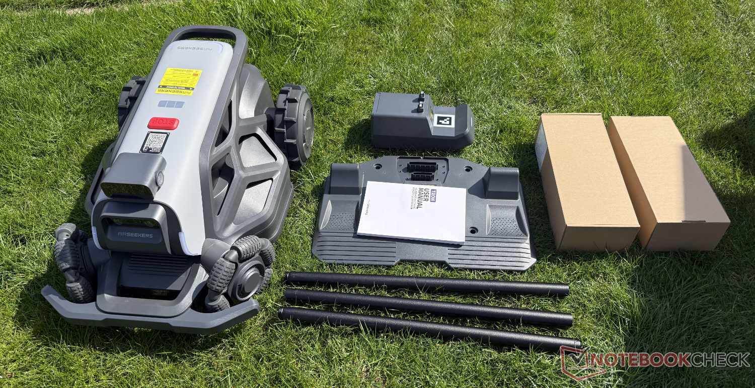 De levering omvat veel onderdelen. Naast de robotmaaier zijn het RTK-basisstation met driedelige buis en grondpin, het laadstation (dat nog in elkaar geschroefd moet worden), twee opladers, zes reservemessen, gereedschap en een beschermplaat allemaal inbegrepen in de doos van 80 x 50 x 45 cm, die 32 kg weegt.