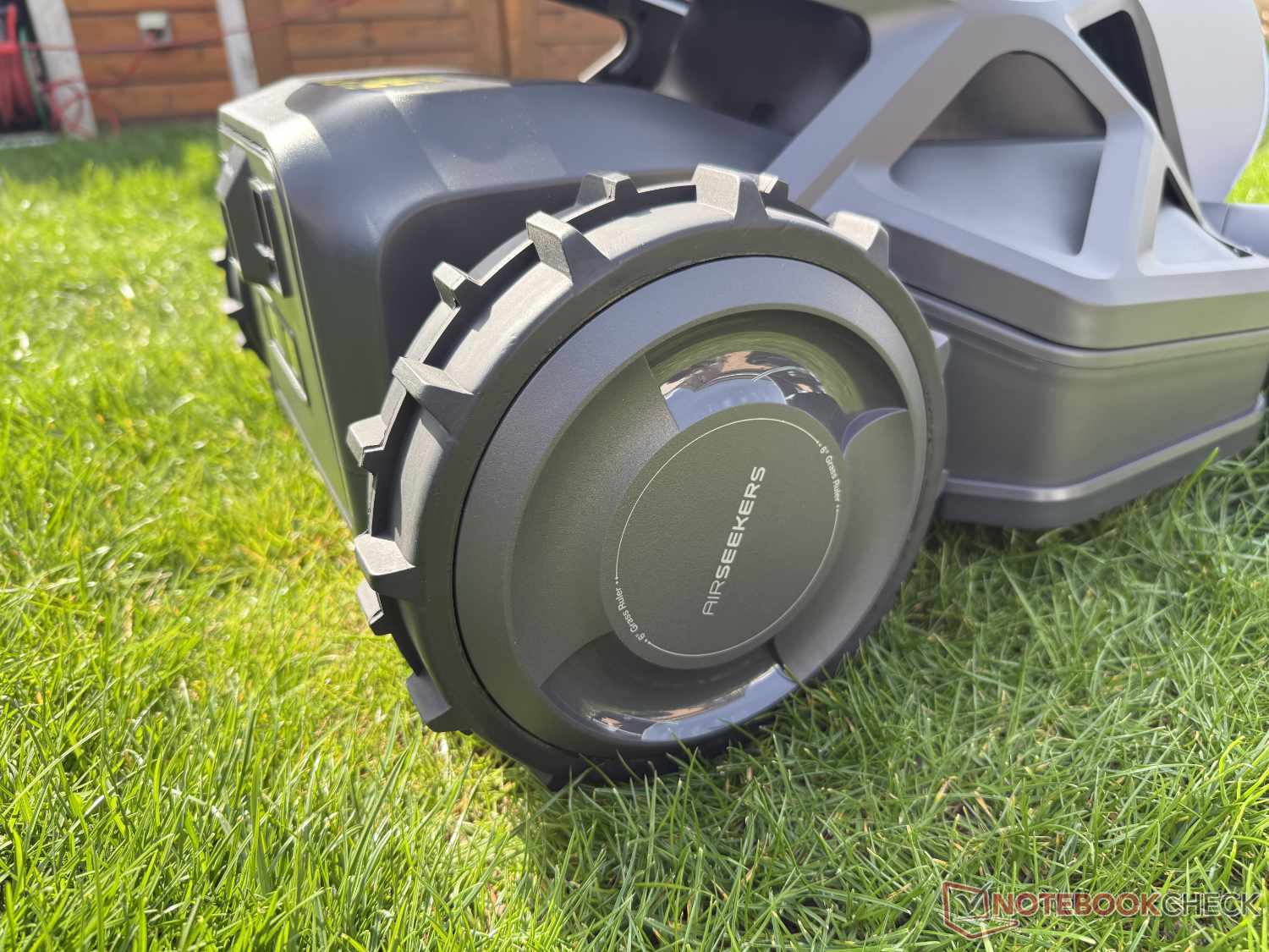 De Airseekers Tron heeft echt vermogen. Hij gaat aan het werk met 2.000 W. Zelfs hoger gras is geen probleem voor hem. Dit resulteert in een betrouwbare maaiprestatie wanneer het betreffende gebied wordt doorkruist (en de soms niet helemaal vlakke rupsbanden roet in het eten gooien). Tijdens het rijden profiteert de Tron ook van zijn hoge prestaties. Hij beheerst hellingen en ruw terrein met hellingen tot 65%. Hij heeft ook zonder problemen een smal stuk van minder dan 1 m overwonnen.