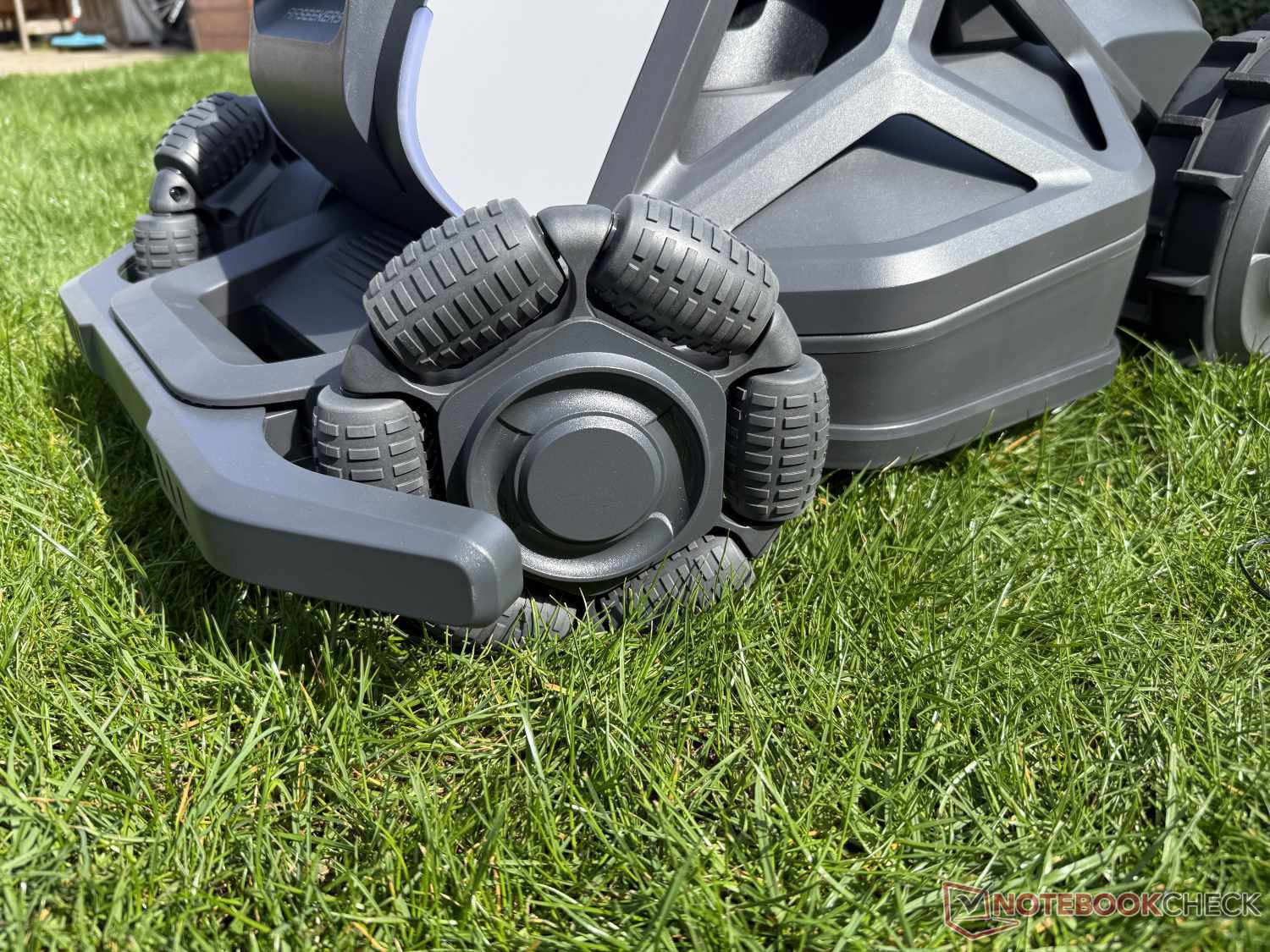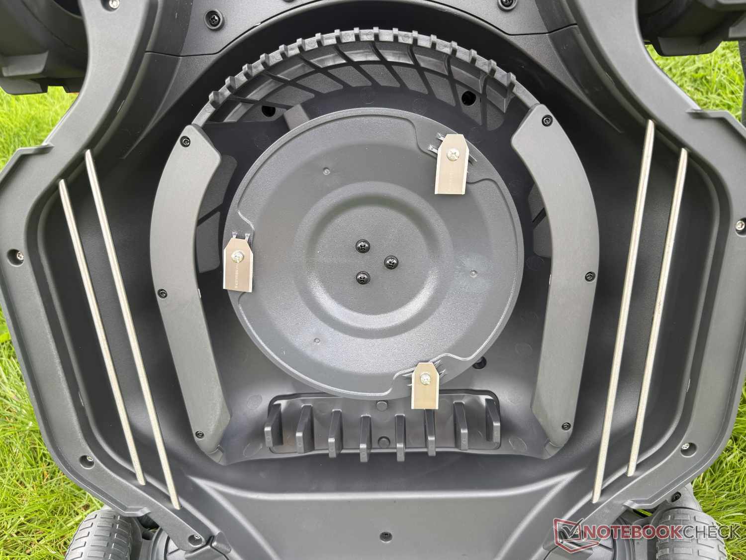 Ondanks de royale afmetingen van de robotmaaier maait hij niet met een dubbele maaier, maar met een enkele maaischijf. Deze is met 22 cm een standaardmaat - en heeft een speciale eigenschap. Er zijn in totaal zes messen geïnstalleerd, twee boven elkaar op een goede centimeter afstand van elkaar. Deze zijn niet alleen ontworpen om het gras op de ingestelde hoogte van 30 tot 90 mm te maaien (instelbaar in stappen van 10 mm), maar ook om tegelijkertijd een ultrafijne grassnede te produceren. De fabrikant noemt dit FlowCut mulchen. Als alternatief kan voor $50 een grotere maaischijf van 300 mm achteraf worden gemonteerd.