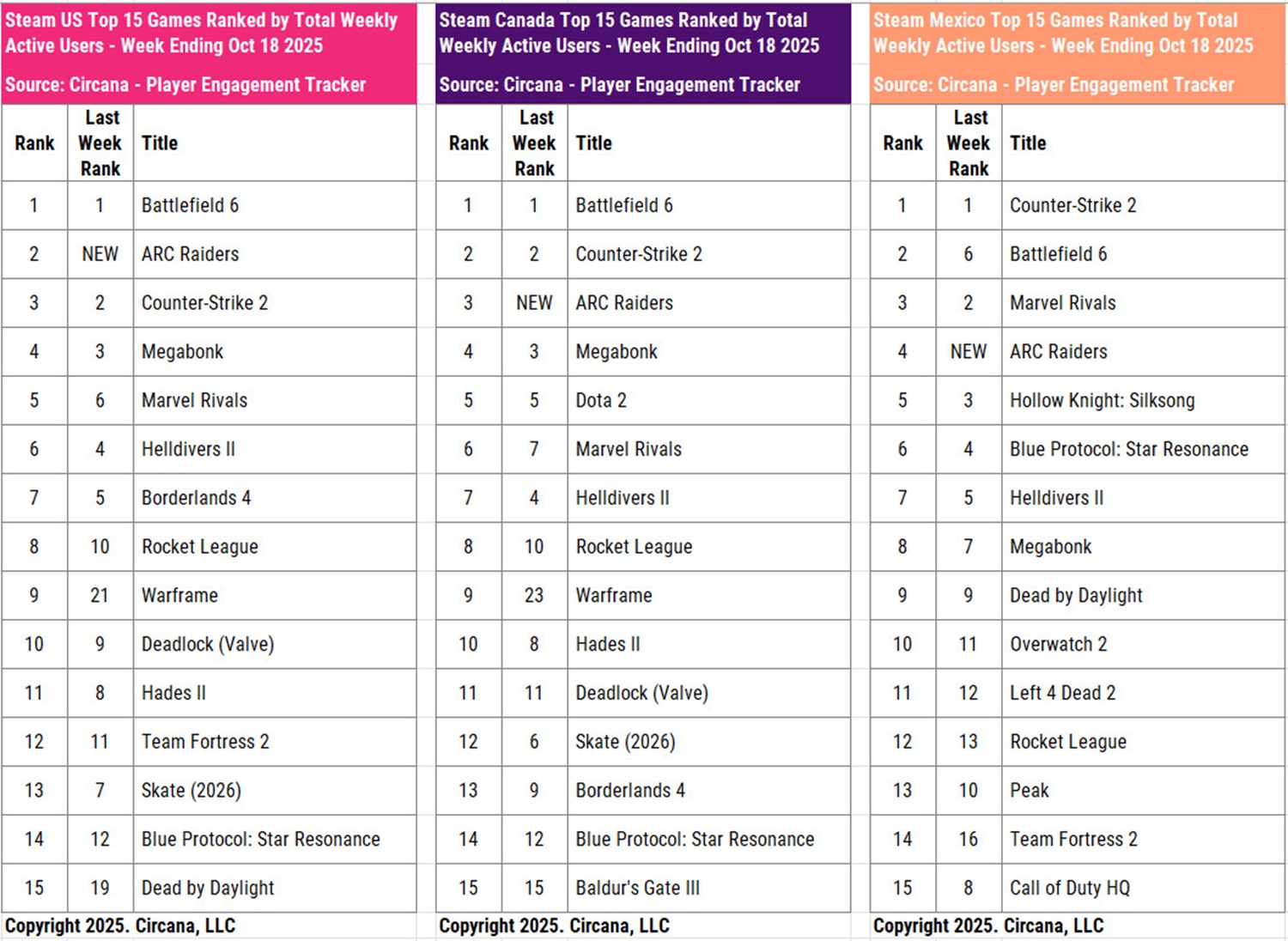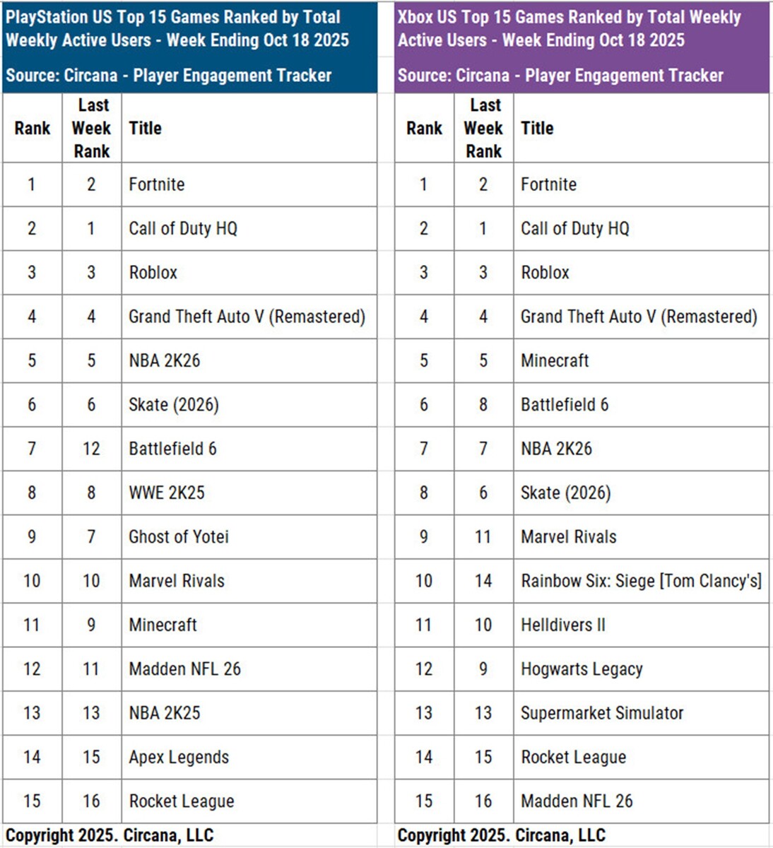Mat Piscatella deelde de gegevens van Circana op Blueskydie de betrokkenheid van spelers op PlayStation en Xbox laten zien. De statistieken hebben betrekking op de week die eindigt op 18 oktober, inclusief de eerste dagen na de releasedatum van Battlefield 6. De totale actieve gebruikers in de VS worden gemeten met de Call of Duty HQ op de tweede plaats achter Fortnite. Ondertussen staat de nieuwe shooter van Dice op de zevende plaats op PlayStation en zesde op Xbox consoles.