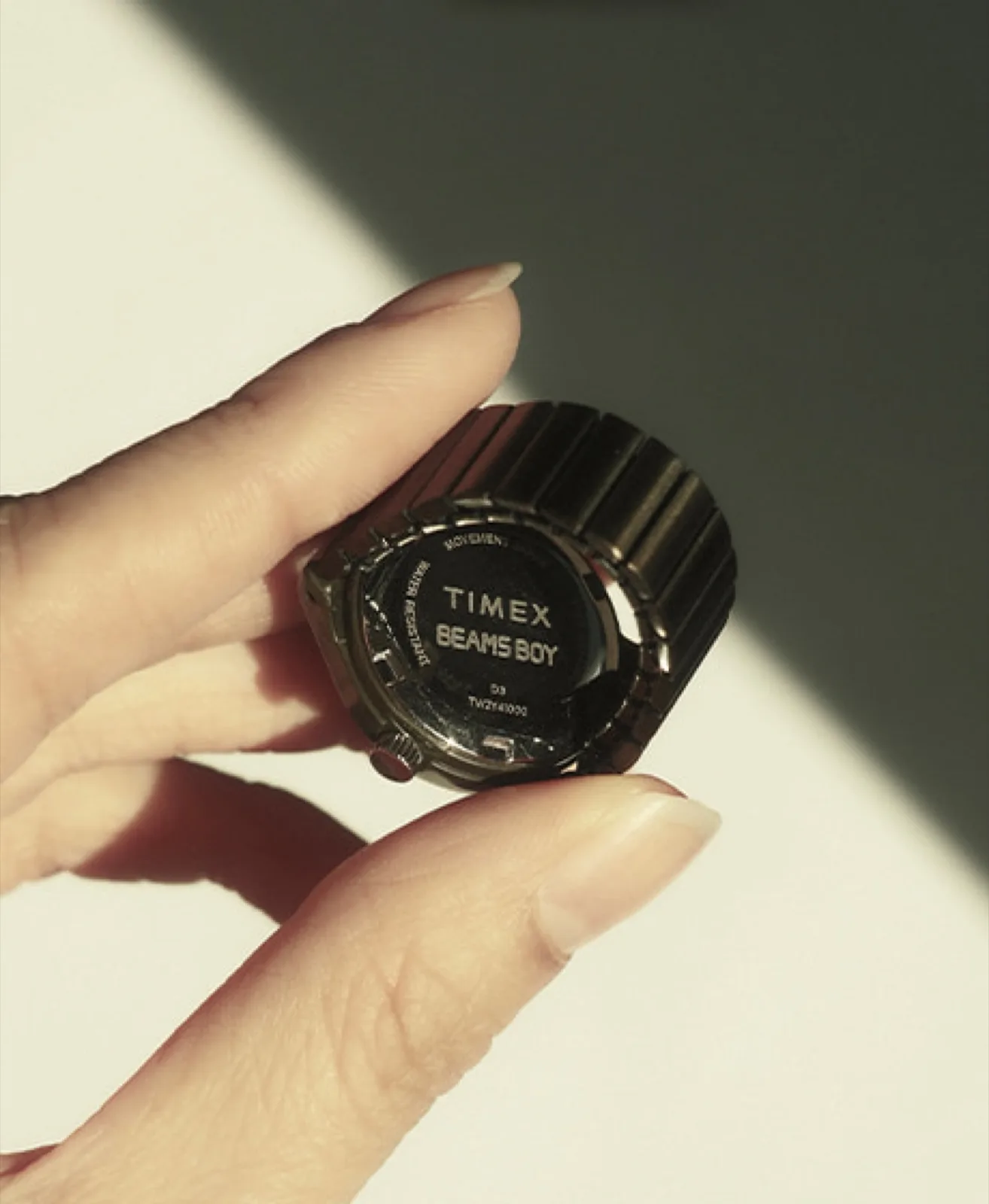 Dit komt omdat het gemaakt is van roestvrij staal en de afzonderlijke elementen met elkaar verbonden zijn door een rekbaar bandje. Hierdoor zou de Ring Watch geschikt moeten zijn voor vingers waaraan gewoonlijk een ring in de Amerikaanse ringmaten 9 tot 15 gedragen wordt. Het is echter niet mogelijk om een schakel van het armbandje te verwijderen om het geschikt te maken voor nog kleinere vingers. De Timex x Beams Boy Ring Watch wordt in april gelanceerd om de 50e verjaardag van de eerste Beams-winkel in Harajuku, Japan te vieren.