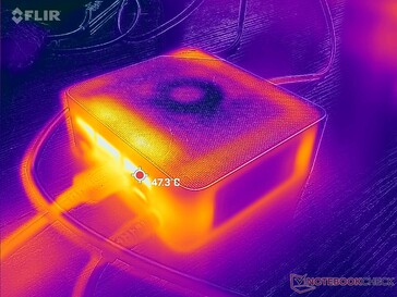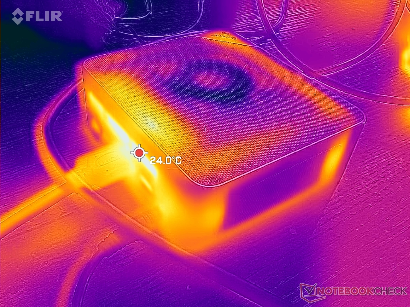 Het stroomverbruik is relatief hoog, wat de groter dan verwachte AC-adapter kan verklaren. Stationair draaien op de desktop verbruikt ongeveer 17 W, vergeleken met minder dan de helft daarvan bij andere mini PC's uit de U-serie, zoals de SER4 of Intel NUC11. Bij veeleisende belastingen, zoals games, ligt het verbruik gemiddeld rond de 50 W, vergeleken met iets minder dan 40 W op de NUC11.