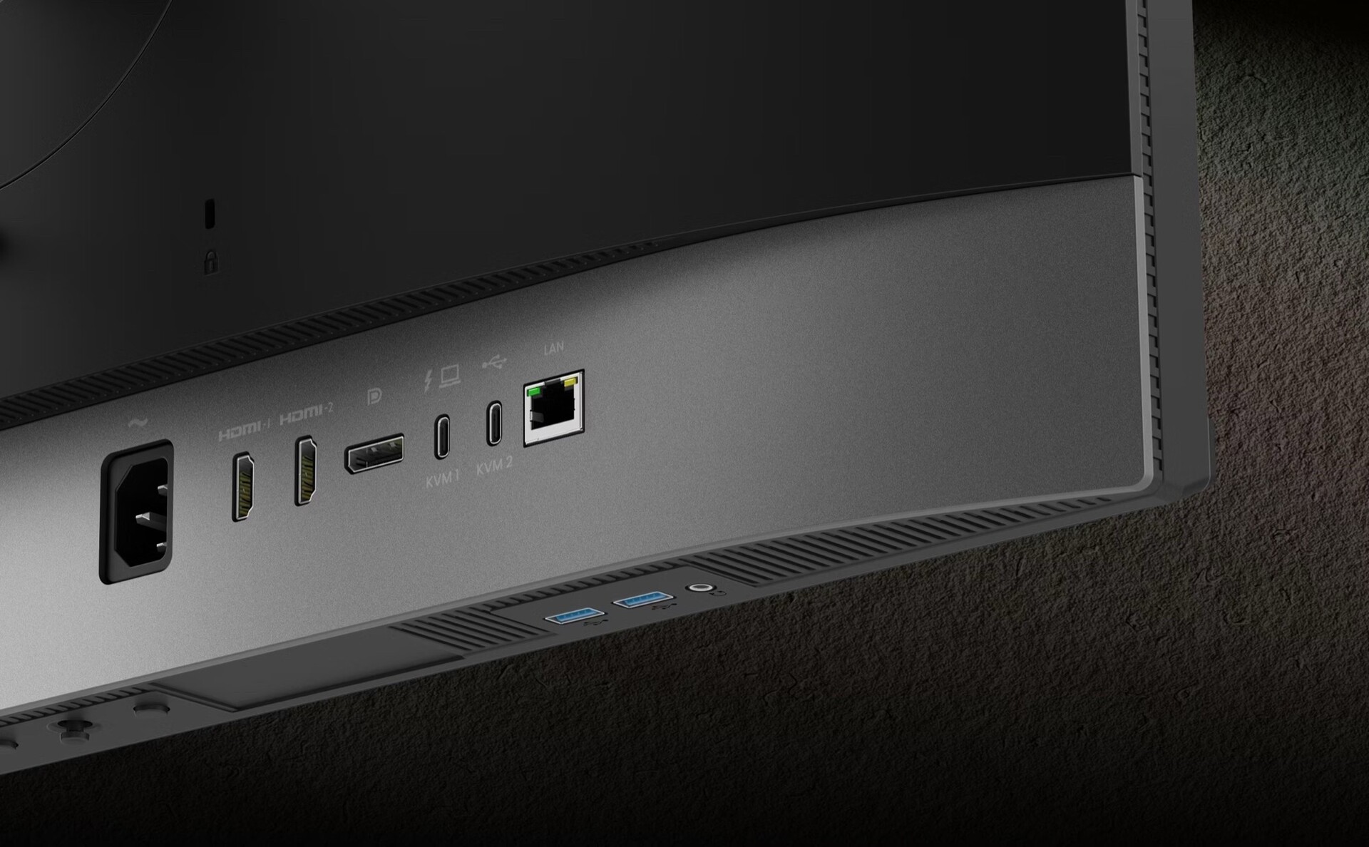 De monitor ondersteunt Thunderbolt 4 en kan via USB-C aangesloten laptops opladen met 96 watt. Een geïntegreerde KVM-switch, een USB-hub met twee poorten, twee HDMI-poorten, DisplayPort, Ethernet en een in hoogte verstelbare standaard ronden de functies af.
