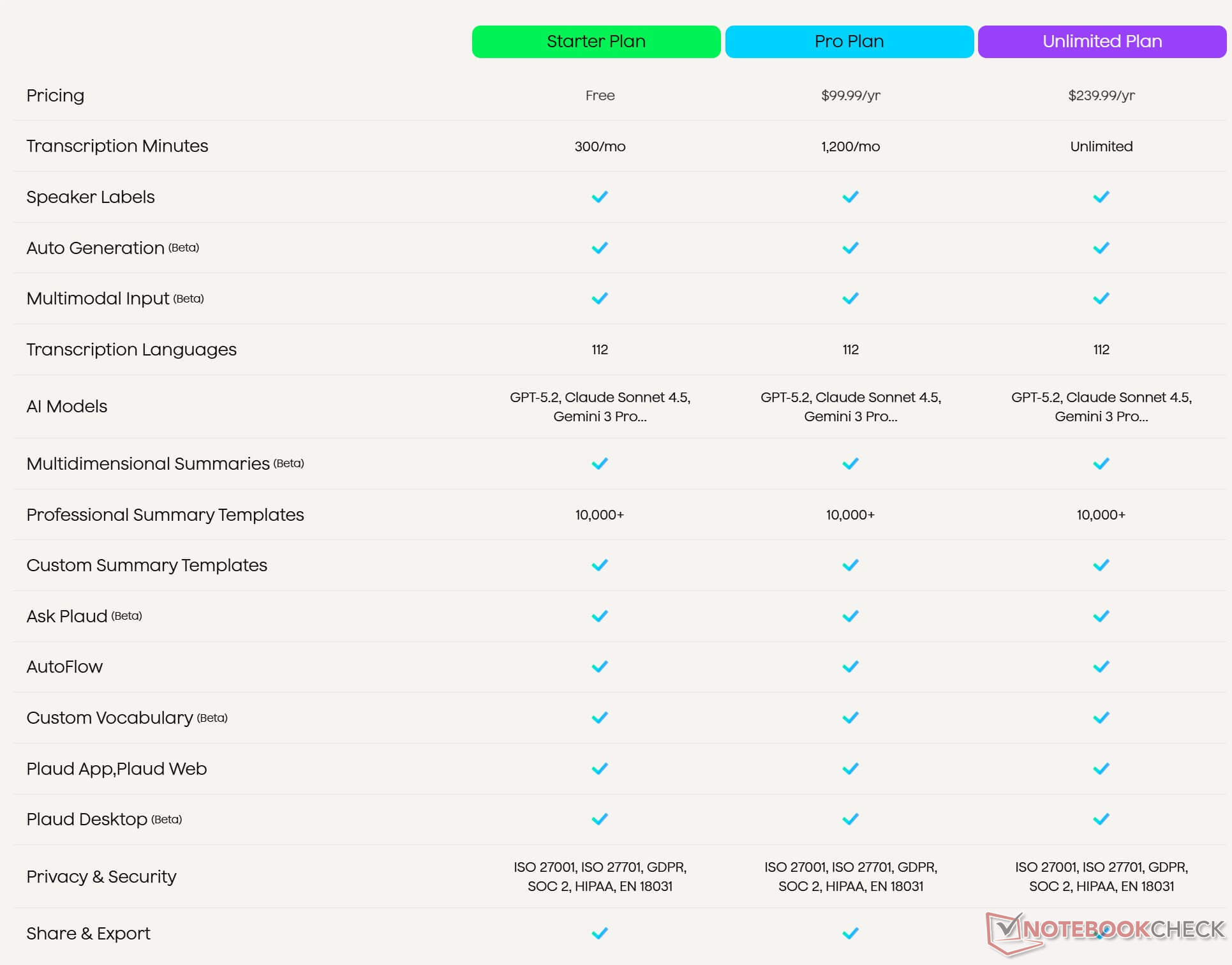 De opnamekwaliteit was in alle tests goed, en de transcriptie, samenvatting en vertaling waren ook van hoge kwaliteit. Dit betekent dat vergaderingen, klantgesprekken en andere vormen van communicatie ook op andere professionele gebieden goed opgenomen en samengevat zouden moeten worden, vooral omdat er meer dan 10.000 samenvattingssjablonen beschikbaar zijn om de verwerking van de AI aan te passen aan specifieke beroepen. Alleen de abonnementen verminderen de positieve indruk. Zonder extra kosten kunt u de AI-functies voor transcriptie enz. slechts vijf uur per maand gebruiken. Deze limiet is snel bereikt, vooral in een professionele omgeving. De enige oplossingen hier zijn het Pro Plan, dat 20 uur per maand biedt voor $99,99 USD per jaar, of het Unlimited Plan voor $239,99 USD, dat de tijdslimiet volledig opheft. Volgens de fabrikant zijn alle andere functies op alle abonnementsniveaus identiek.