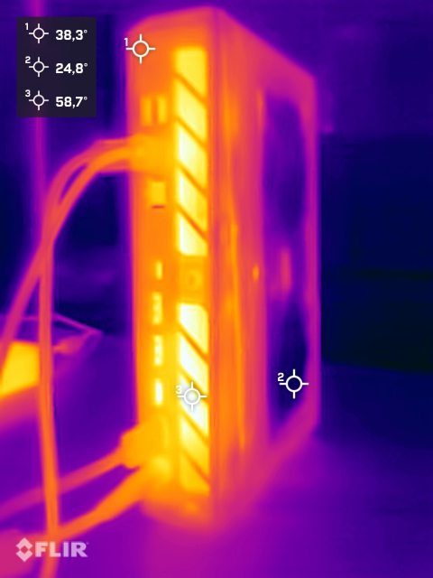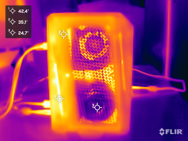 (±) De maximumtemperatuur aan de bovenzijde bedraagt 41.6 °C / 107 F, vergeleken met het gemiddelde van 36 °C / 97 F, variërend van 21.6 tot 69.5 °C voor de klasse Mini PC.