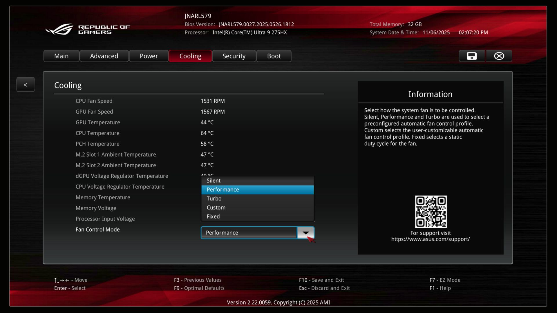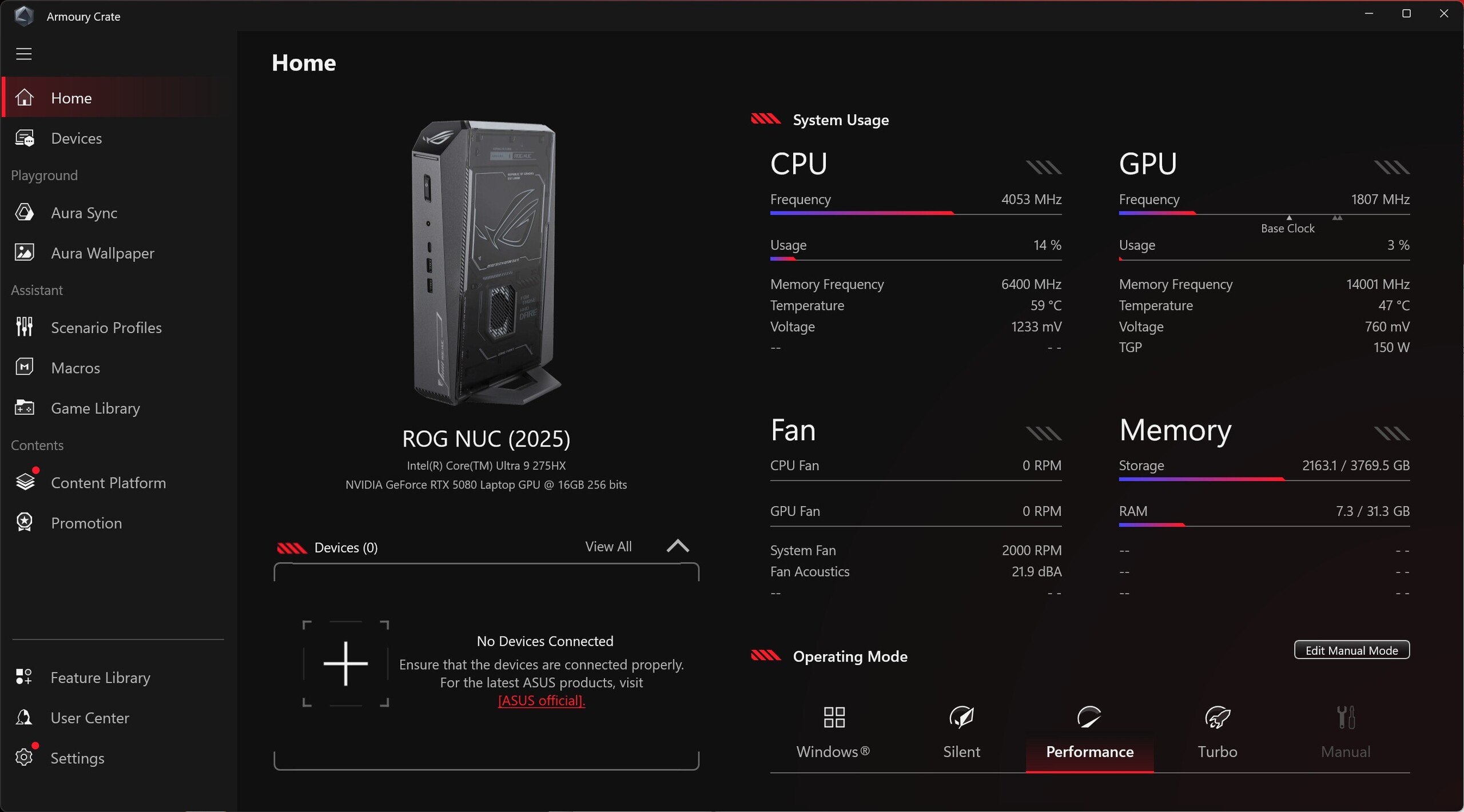 We gebruikten het energieprofiel "Prestaties" voor alle prestatietests met dit apparaat. Het uitgebreid ontworpen UEFI biedt veel mogelijkheden om het apparaat aan te passen. Er kunnen verschillende prestatieprofielen en ventilatorprofielen worden geselecteerd. De prestaties kunnen ook gemakkelijk worden aangepast in het Windows besturingssysteem met behulp van het bekende Armoury Crate hulpmiddel.