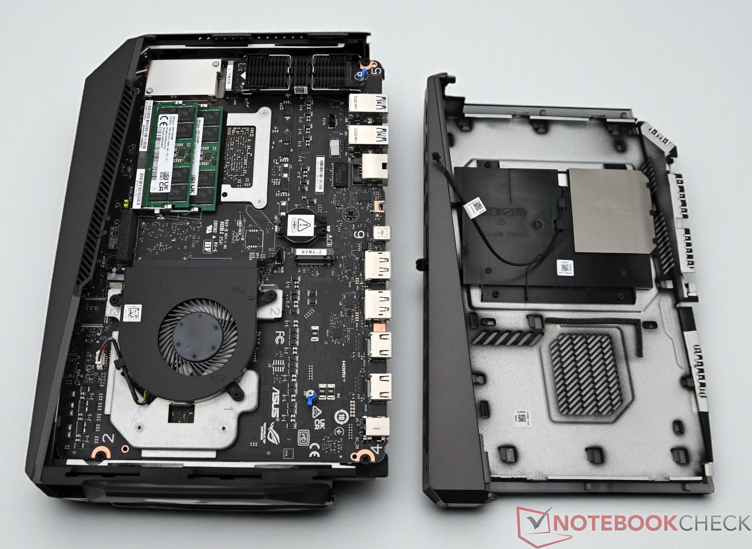 Onderhoudswerk aan de Asus ROG NUC 15 is zonder problemen mogelijk. Asus maakt komaf met ingewikkelde schroefverbindingen, zodat het RAM en de SSD gemakkelijk bereikbaar zijn. Na het verwijderen van het zijpaneel is er ruimte voor maximaal twee M.2 SSD's. De WLAN-module kan indien nodig ook vervangen worden.