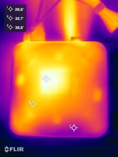 (+) De maximumtemperatuur aan de bovenzijde bedraagt 35.7 °C / 96 F, vergeleken met het gemiddelde van 36 °C / 97 F, variërend van 21.6 tot 69.5 °C voor de klasse Mini PC.