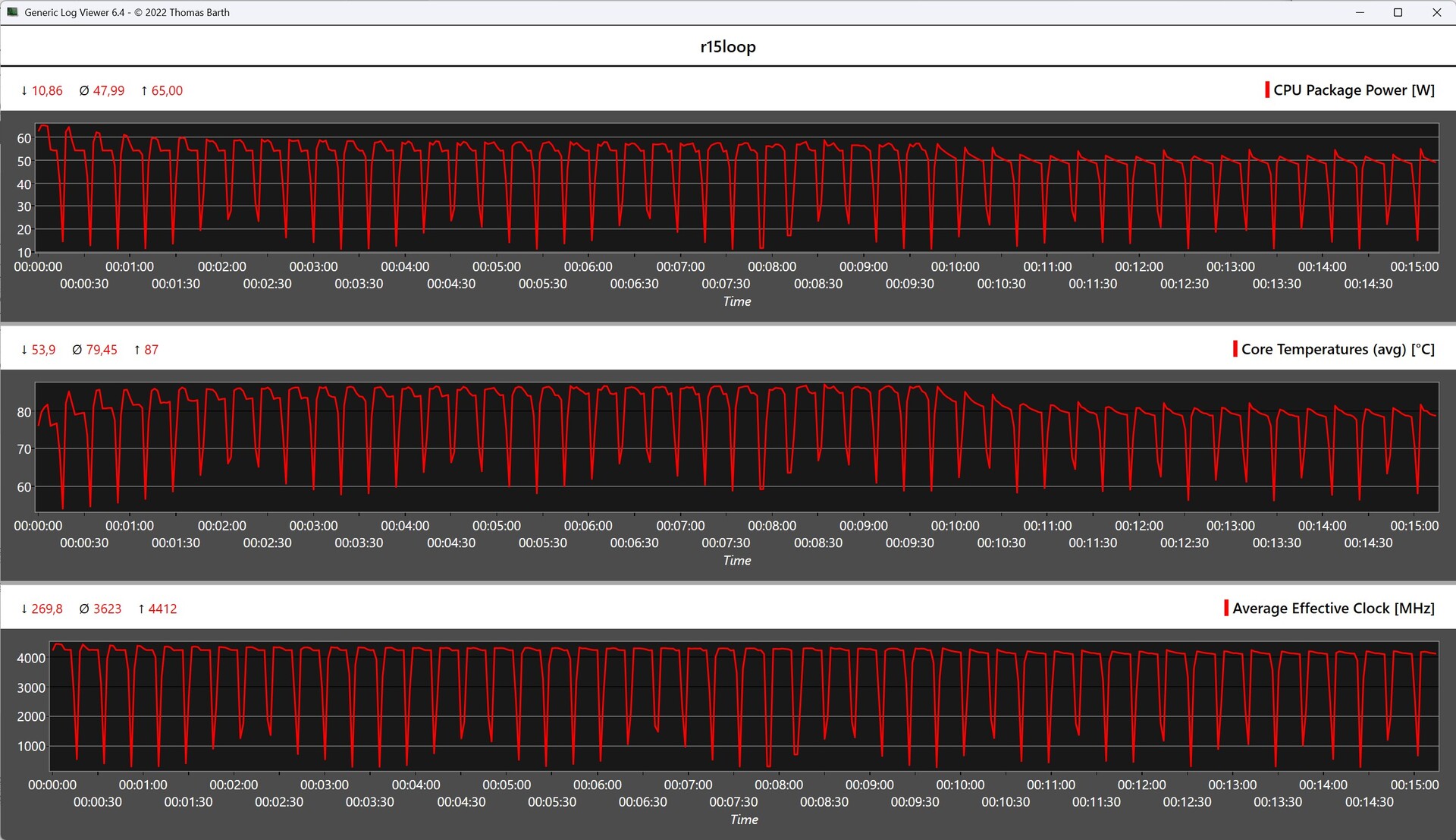 De Geekom A8 Max met AMD Ryzen 7 8845HS (Zen 4, 8 cores) haalt tot 65 watt tijdens korte uitbarstingen, maar hapert bij langdurige belasting. Dit gedrag is vooral merkbaar in multi-core benchmarks zoals de Cinebench R15 duurtest, terwijl de single-core prestaties stabiel blijven. Over het geheel genomen behoort de A8 Max tot de krachtigste 8-core mini PC's die momenteel verkrijgbaar zijn. Een versie met de AMD Ryzen AI 9 HX 370 is nog niet uitgebracht door Geekom.