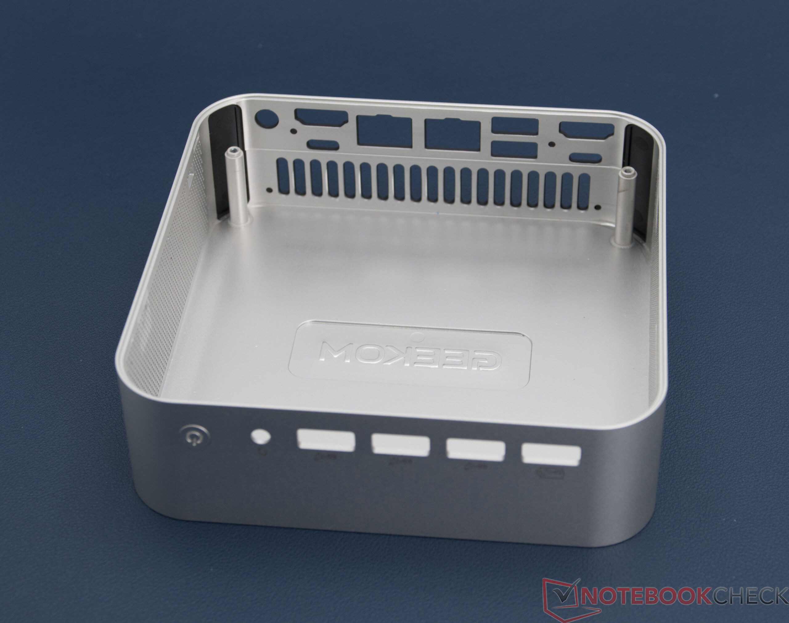 De Geekom A8 Max heeft een grotere behuizing dan de vorige modellen, is voornamelijk gemaakt van zilverkleurig aluminium en lijkt qua ontwerp erg op de GT1 Mega, met als enige opvallende verschil de kleur. De bouwkwaliteit is solide en goed afgestemd op de prijs. Ondanks de grotere afmetingen weegt de A8 Max slechts 681 gram, waardoor hij lichter is dan sommige concurrerende modellen. De 261 gram wegende voeding is ook compact en onopvallend.