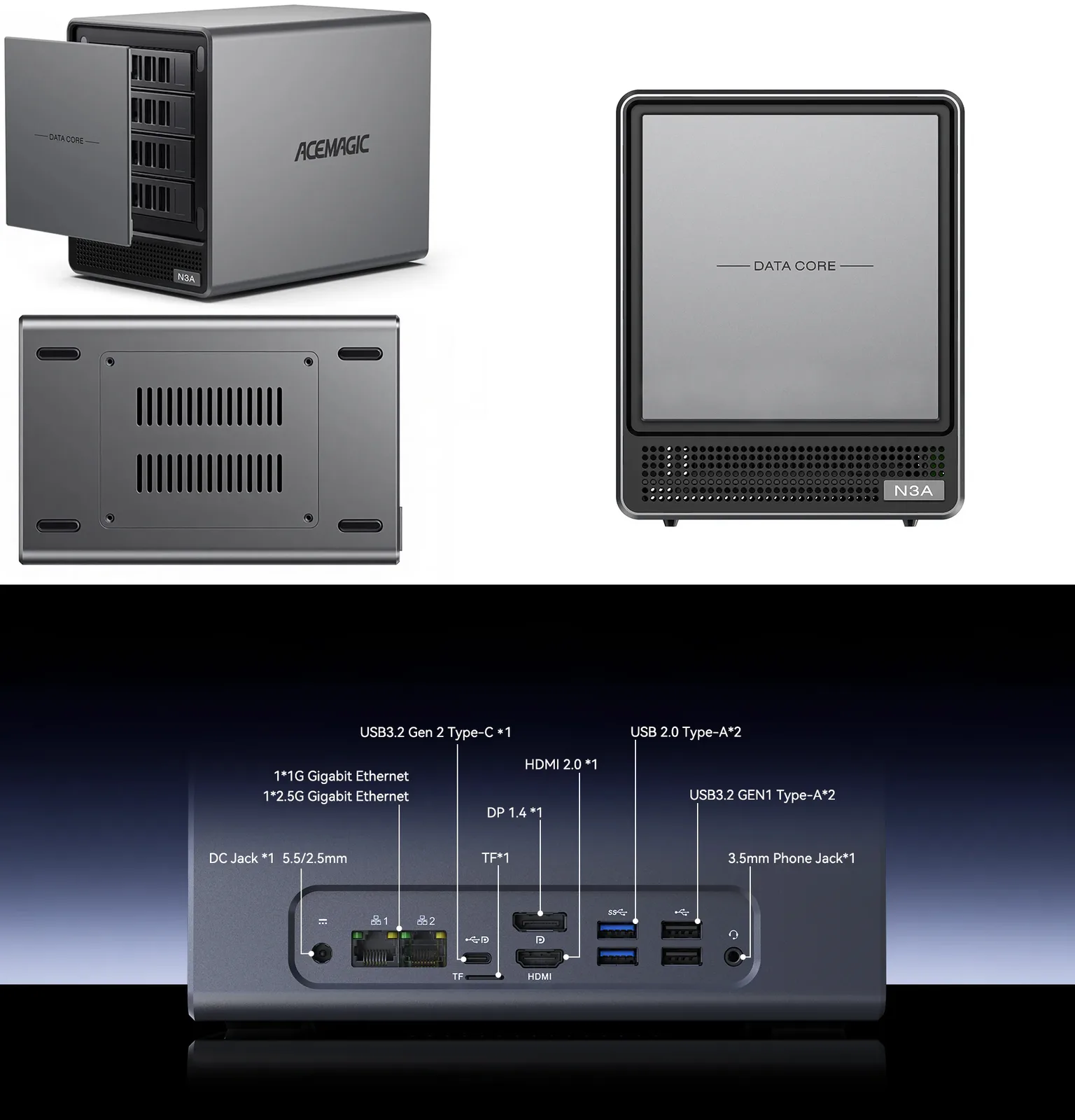 Qua ontwerp heeft de mini PC een volledig metalen behuizing en een magnetische voorkant. De SATA-schijfstations hebben een eenvoudig uitschuifmechanismewaardoor opslag snel vervangen en geïnstalleerd kan worden. Acemagic merkt verder op dat de dual-cooling setup van de NAS zorgt voor optimale 24/7 prestaties.