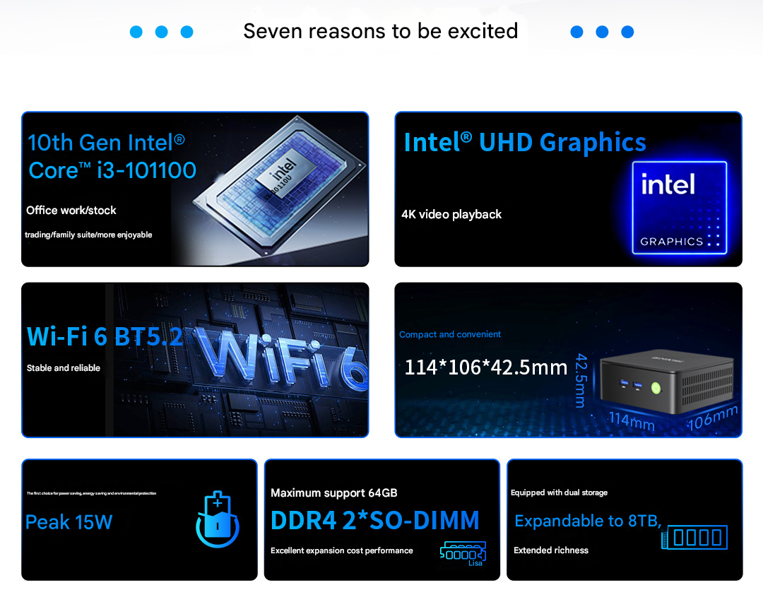 Hij is uitgerust met de Core i3 10110U, een betaalbare mobiele processor uit de Comet Lake reeks. De CPU heeft twee kernen en vier threads, wat betekent dat de mini-pc niet in staat zal zijn om zware werklasten met gemak aan te kunnen. Er is de Intel UHD 620 iGPU, die sprongen achterloopt op de nieuwste geïntegreerde GPU-oplossingen, maar gewone media nog steeds goed aankan.