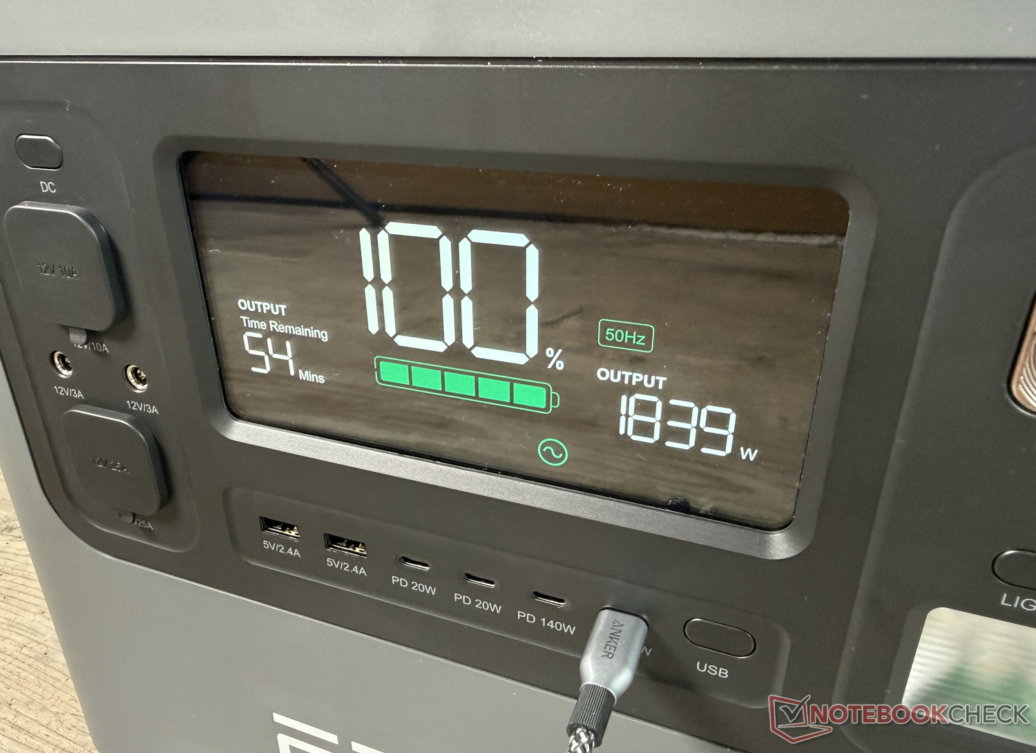 Tijdens het AC-laden haalde de Powerstation de beloofde 1800 W vanaf het begin en tot een goede 60 procent. Na ongeveer 65 minuten was 80 procent opgeladen en na nog eens 50 minuten was het laadproces voltooid. Het opladen op zonne-energie kon slechts beperkt worden getest vanwege het gebrek aan zonneschijn in de huidige winter in Hamburg. Bij DC laden en ontladen (gelijkstroom) is het rendement over het algemeen hoger, omdat er geen omzettingsverliezen naar wisselstroom zijn.