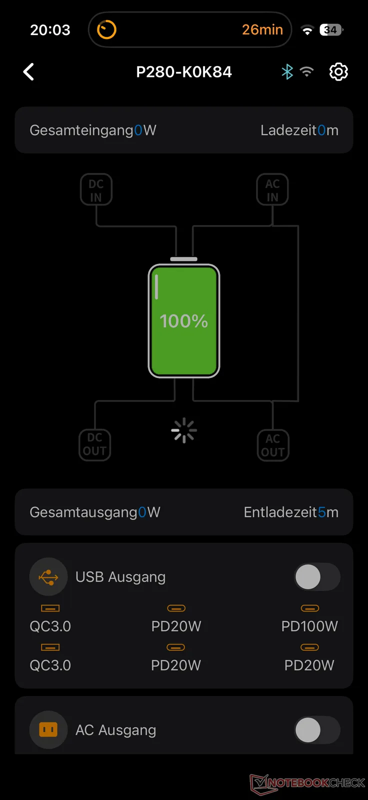 Sommige andere aansluitingen zijn ook "verborgen", maar de USB-poorten onder het scherm niet. Dit geeft informatie over alle belangrijke gegevens, zoals het huidige ingangs- en uitgangsvermogen en welke aansluitingen in gebruik of ingeschakeld zijn. De resterende tijd volgens de huidige belastingsstatus wordt ook weergegeven, hoewel dit naar het einde toe aanzienlijk afweek. De iOS app zou eigenlijk hetzelfde moeten doen - maar laten we het daar maar niet weer over hebben...
