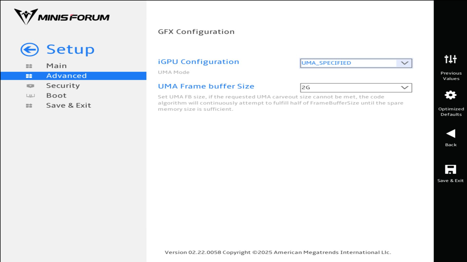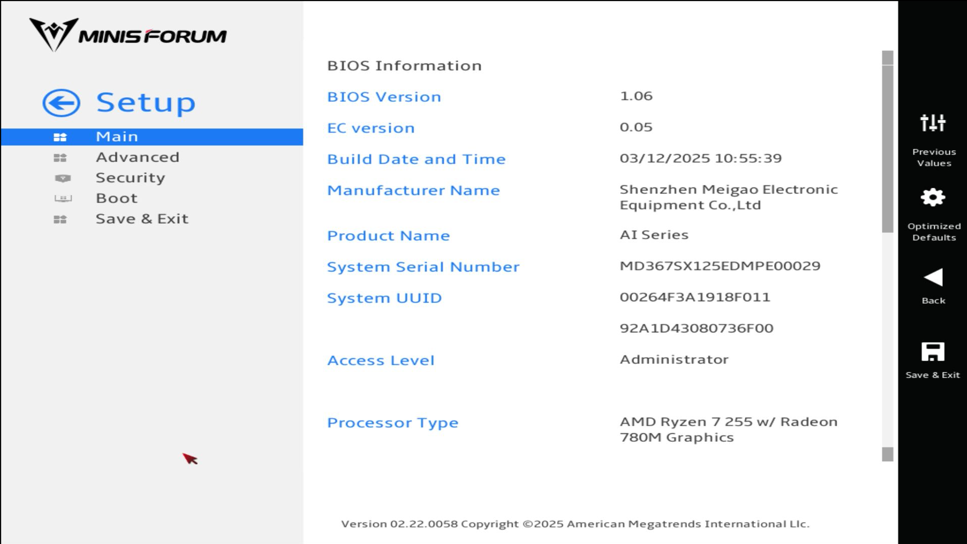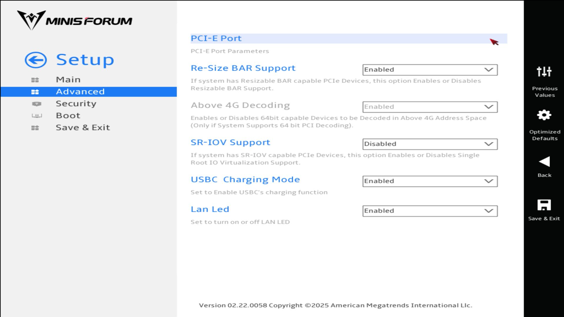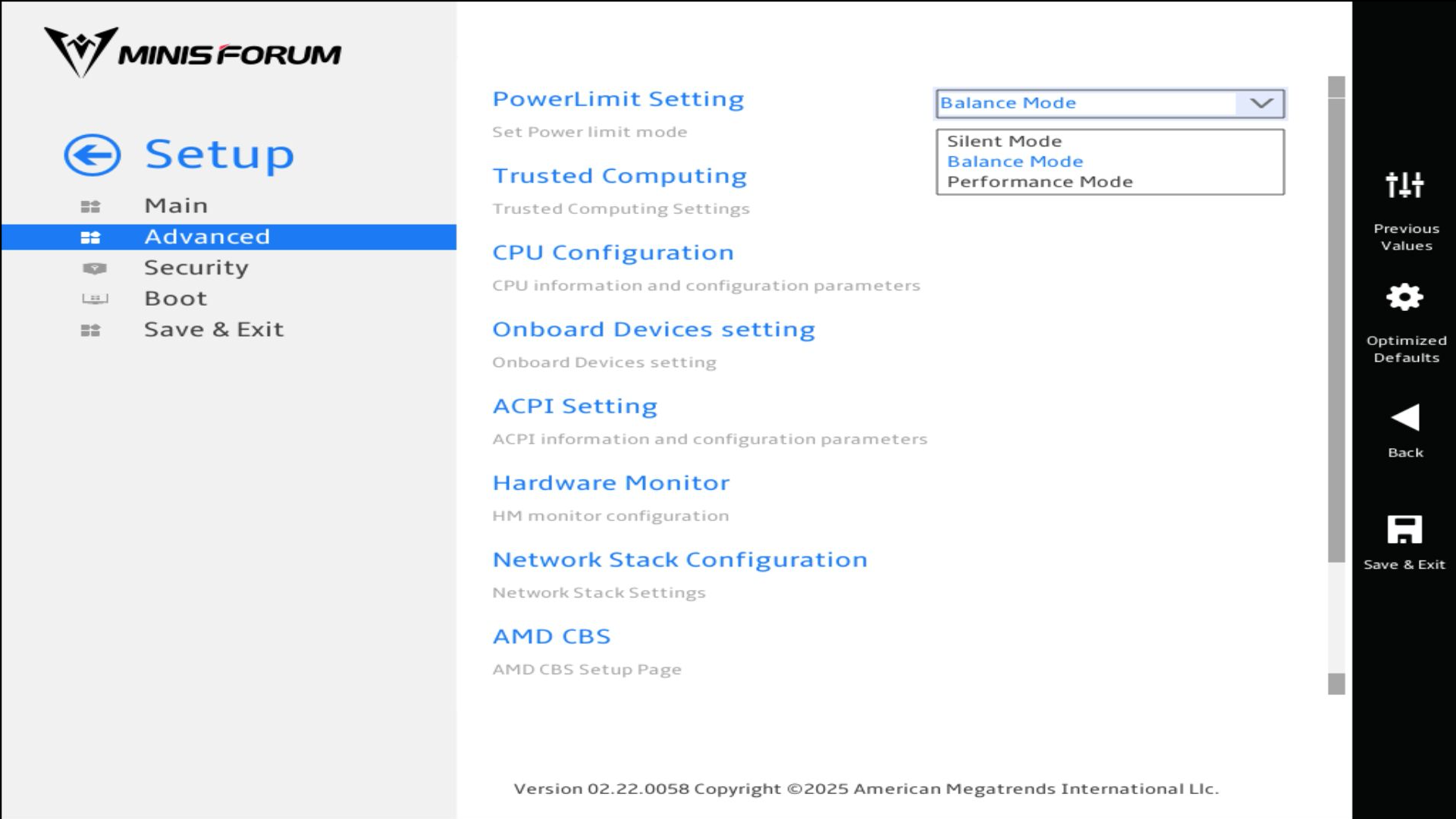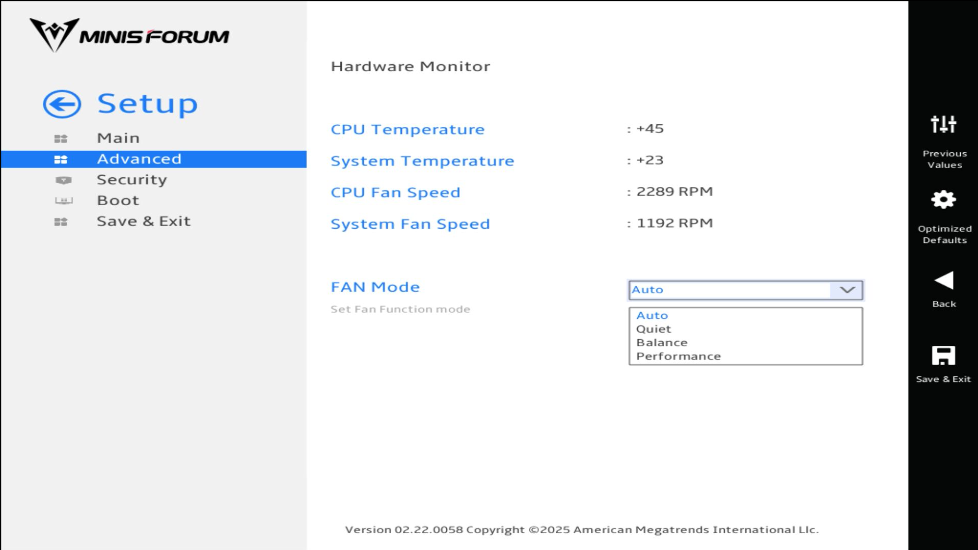 Alle prestatietests van de Minisforum AI X1 werden uitgevoerd met de fabrieksinstellingen. In het UEFI biedt Minisforum ook de mogelijkheid om zowel het prestatieprofiel van de processor als de ventilatorregeling aan te passen.