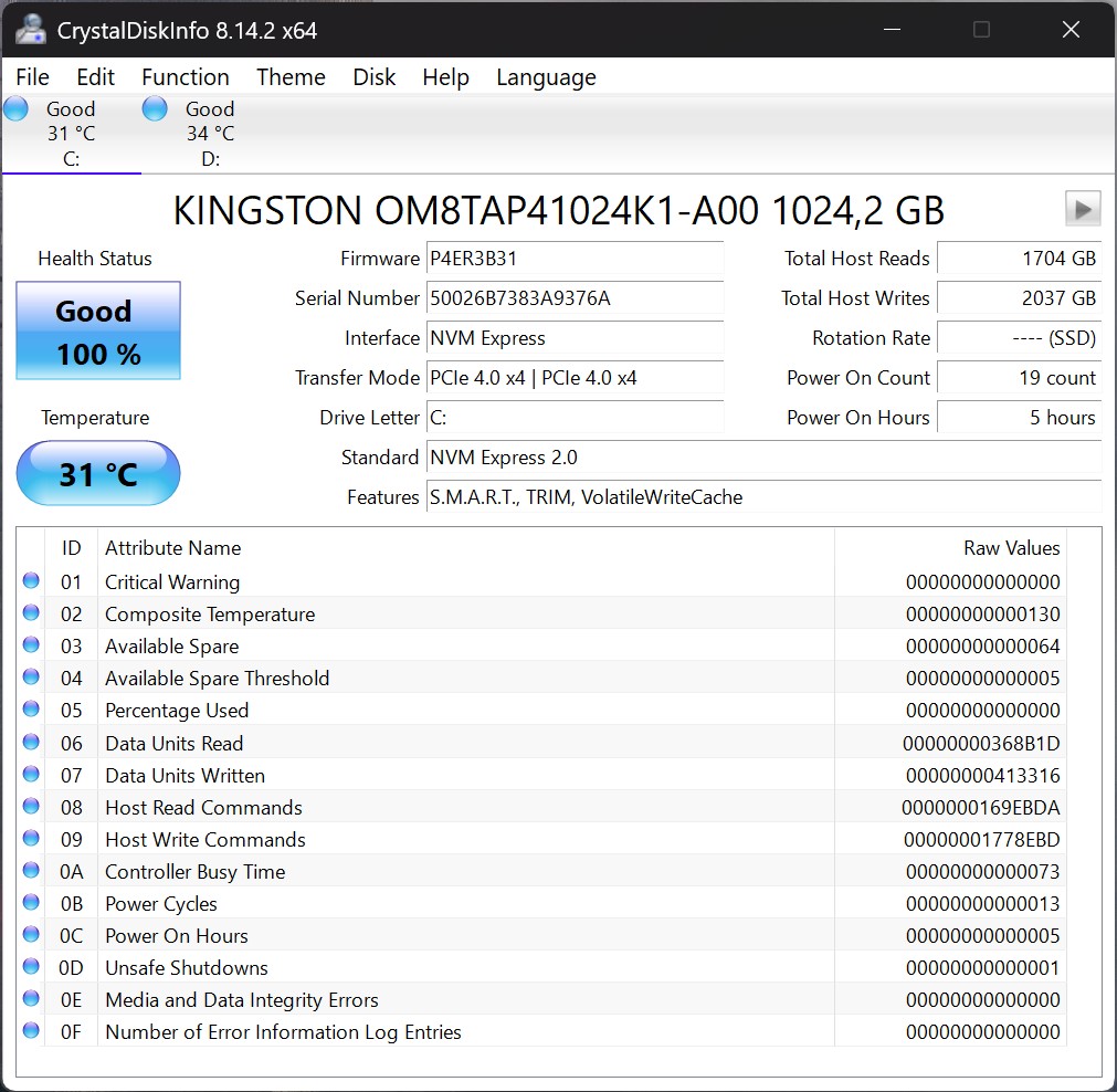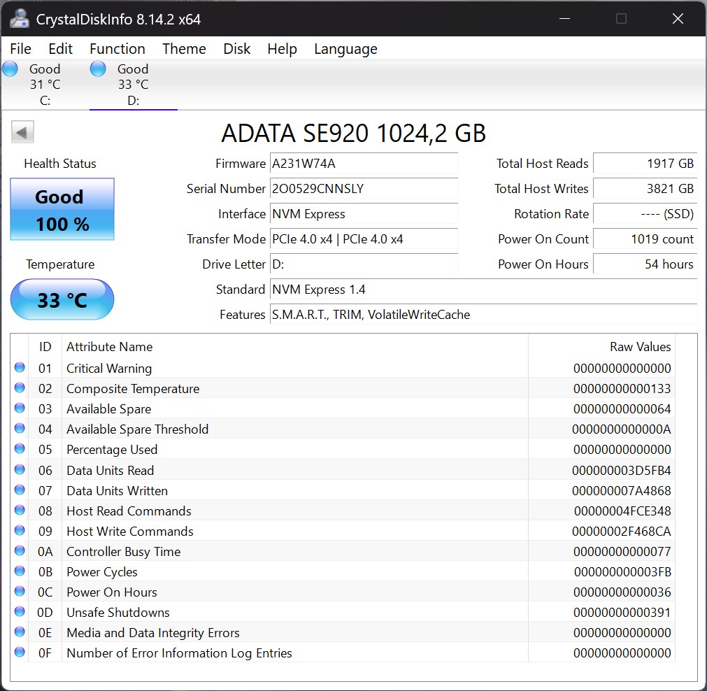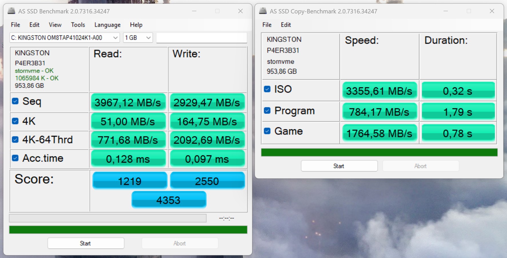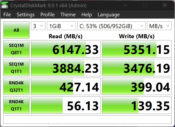 De Minisforum AI X1 maakt gebruik van een 1 TB SSD van Kingston met een PCIe 4.0 x4-aansluiting, die betrouwbare, zij het niet uitstekende overdrachtsnelheden biedt. De actieve koeling zorgt ook voor blijvend stabiele prestaties en voorkomt dips tijdens langdurige belasting. Er zijn twee M.2 slots beschikbaar voor opslag, maar wanneer de OCuLink-adapter in gebruik is, kan slechts één ervan worden gebruikt.
