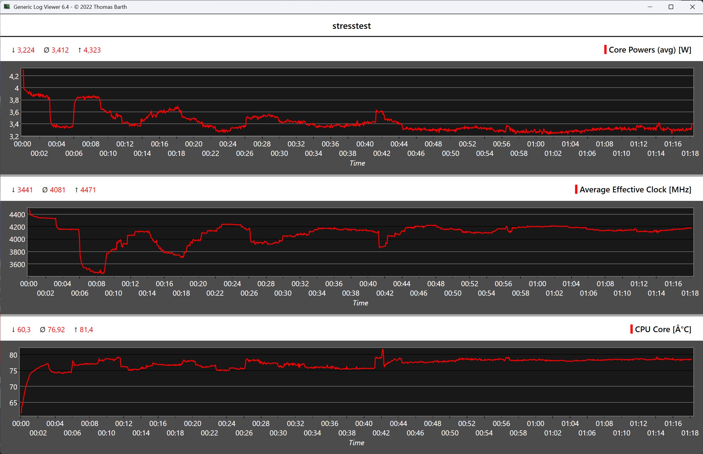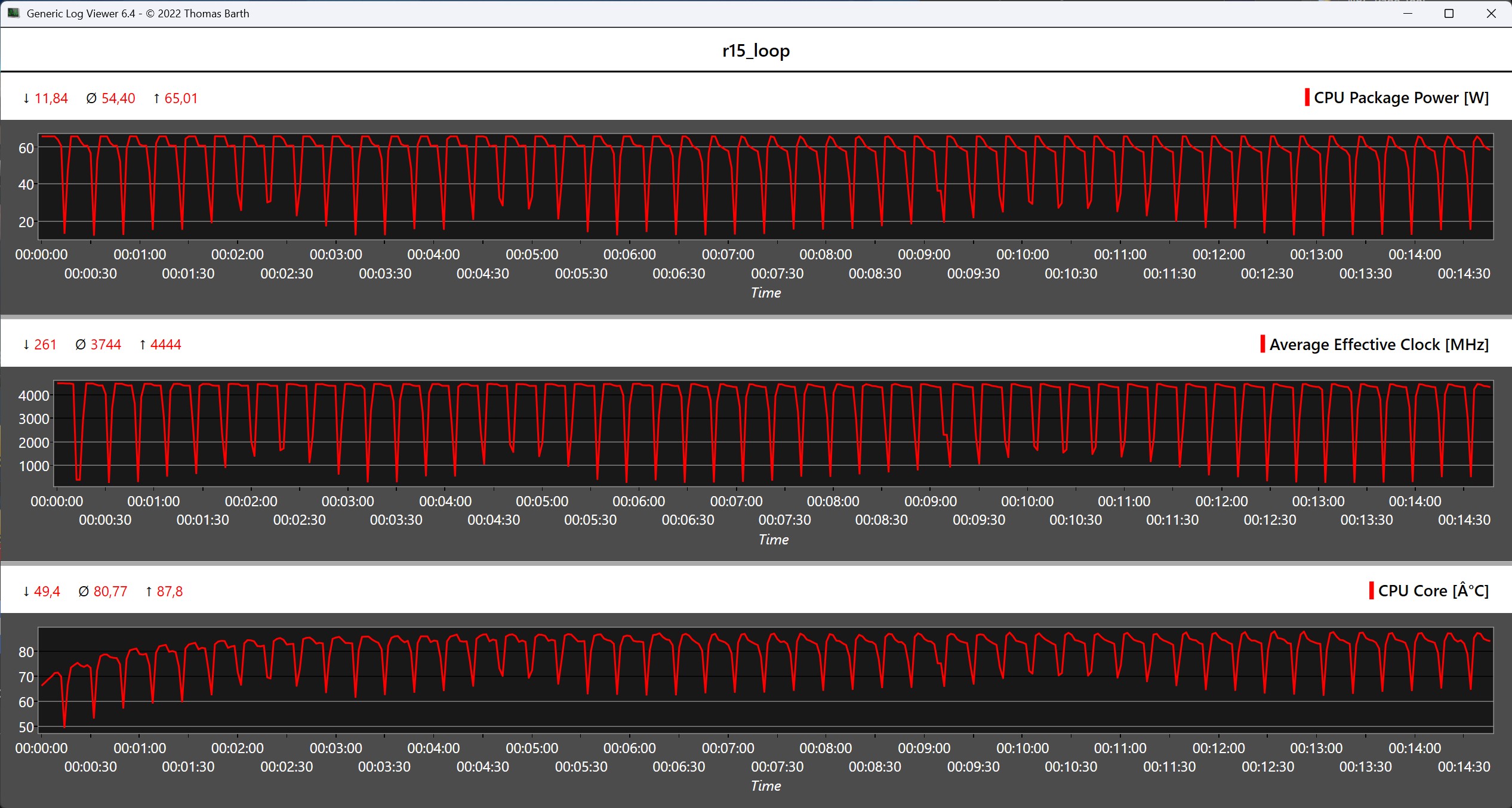 In de eerste langere stresstest met de Cinebench R15 continue loop laat de Minisforum AI X1 zien dat de AMD Ryzen 7 255 zelfs over langere perioden geen significante prestatiedaling vertoont. De analyse van de telemetriegegevens bewijst dat de SoC kan werken met maximaal 54 watt onder continue belasting. De temperatuur van de Ryzen 7 255 stabiliseert rond de 88 C.