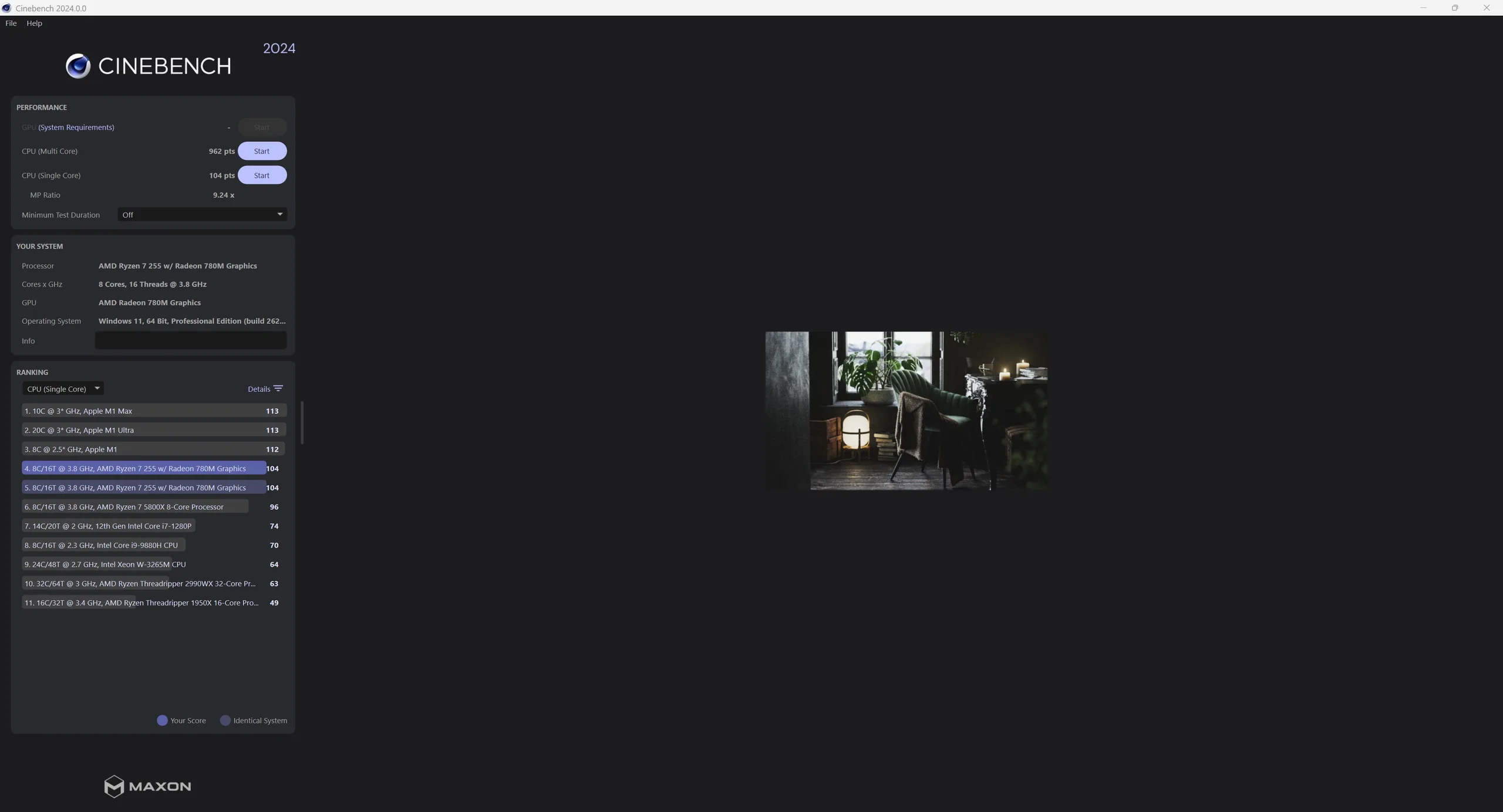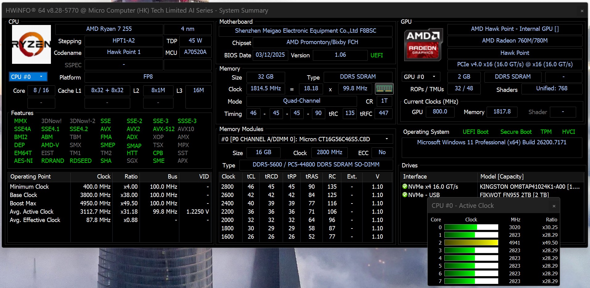 De AMD Ryzen 7 255 in het Minisforum AI X1 levert solide single- en multi-core prestaties dankzij de moderne architectuur. In een directe vergelijking liggen de prestaties op het verwachte niveau van andere 8-core processors, zonder enige herkenbare kunstmatige prestatiebeperking van de fabrikant. De SoC kan ook op korte termijn een stroomverbruik van maximaal 65 watt bereiken.