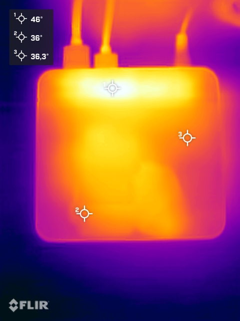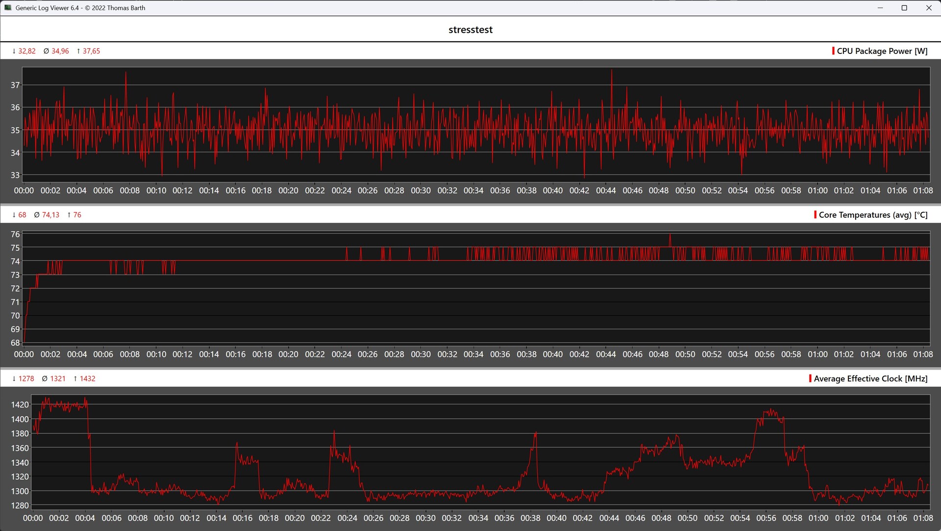 Onder belasting warmt de behuizing van de GMKtec NucBox M3 Ultra merkbaar op en bereikt een piekwaarde van bijna 50 C aan de onderkant. In de stresstest loopt de Intel Core i7-12700H aanvankelijk op tot ongeveer 76 C en stabiliseert zich vervolgens op ongeveer 74 C. Het stroomverbruik van de SoC schommelt lichtjes tussen 33 en 37 watt, hoewel een gemiddelde van 35 watt wordt bereikt.