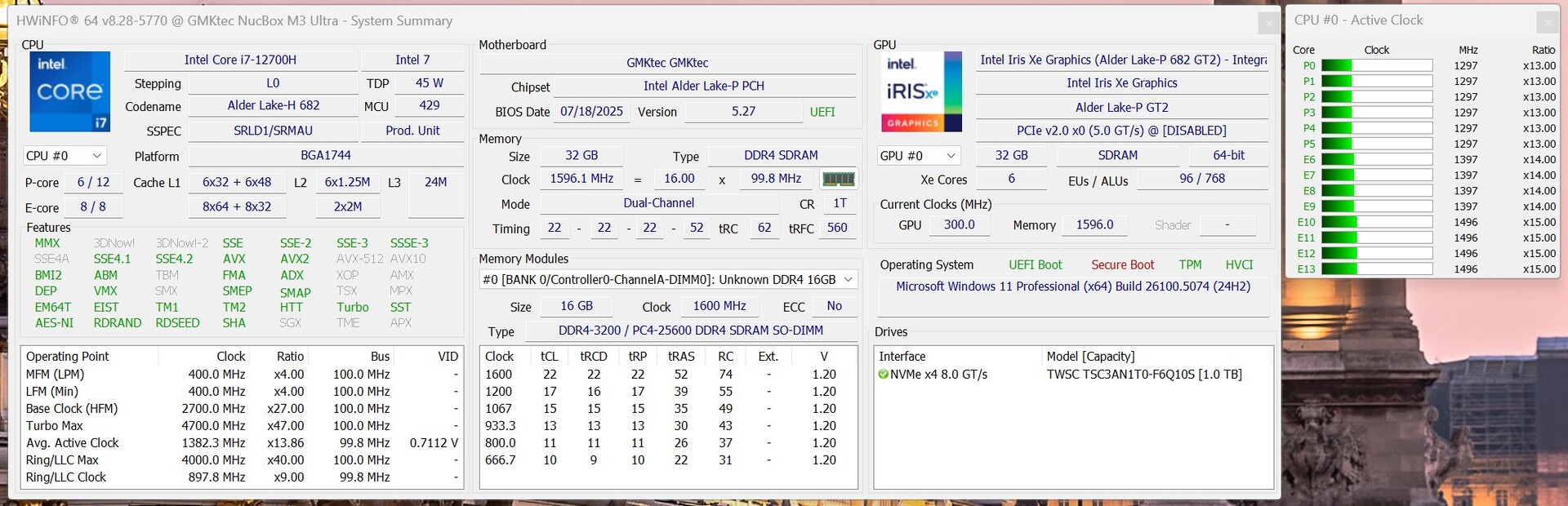 De GMKtec NucBox M3 Ultra combineert hoge rekenkracht met een ultracompacte vormfactor. Binnenin zit een Intel Core i7-12700H, een native 14-core processor met een boostklok tot 4,7 GHz, ondersteund door de geïntegreerde Intel Iris Xe Graphics. Ondanks het kleine formaat biedt de mini PC ruimte voor maximaal 64 GB DDR4 RAM en maximaal 8 TB SSD opslag. Wij testen het model met 32 GB RAM en 1 TB SSD, dat momenteel verkrijgbaar is vanaf ongeveer $429.